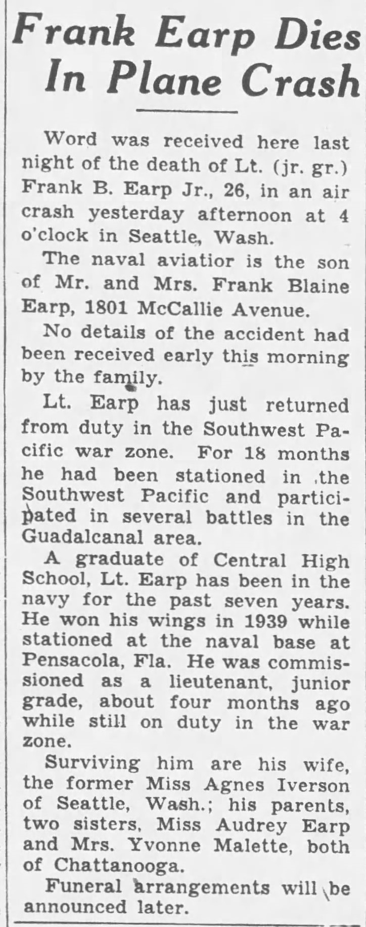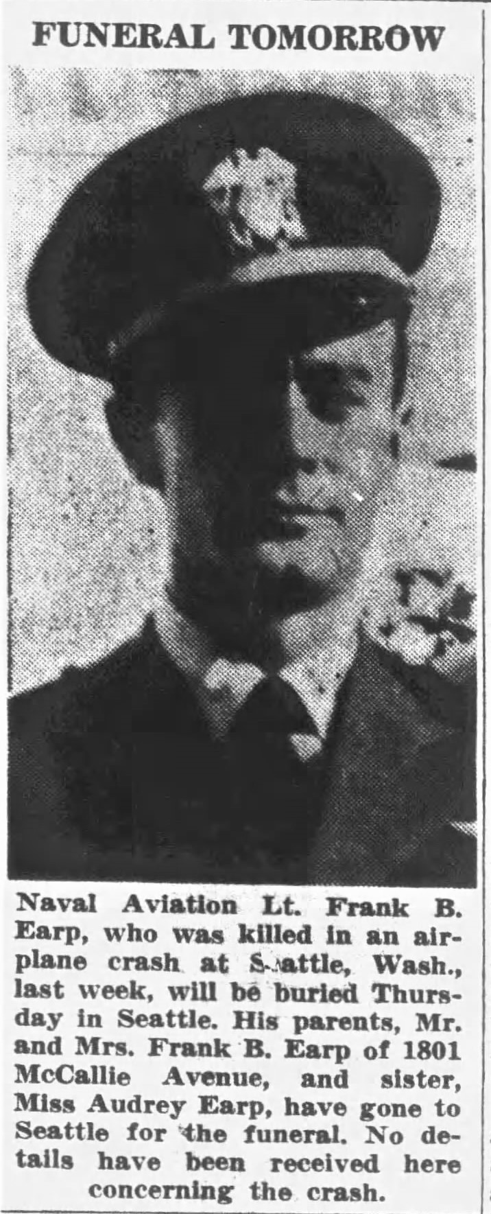 Naval Aviation Lt. Frank B. Earp, who was killed in an airplane crash at Seattle, Wash., last week, will be buried in Seattle. His parents, Mr. and Mrs. Frank B. Earp of 1801 McCallie Avenue, and sister, Miss Audrey Earp, have gone to Seattle for the funeral. No details have been received here concerning the crash.