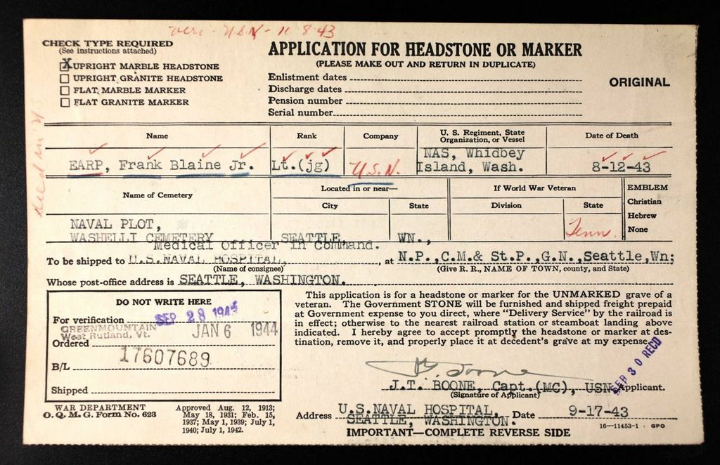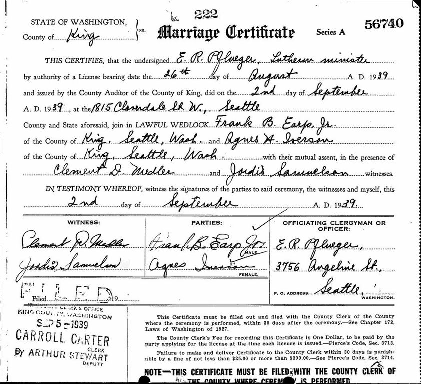 Frank Blaine Earp Jr. was the husband of Agnes A. Iverson. Son of Frank Blaine Earp and Claudia Larkin.