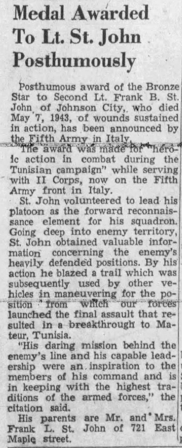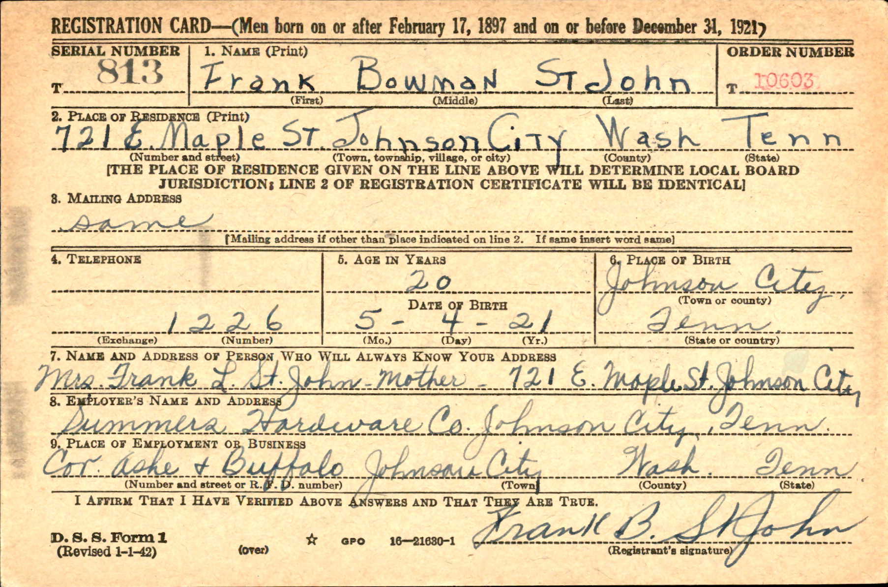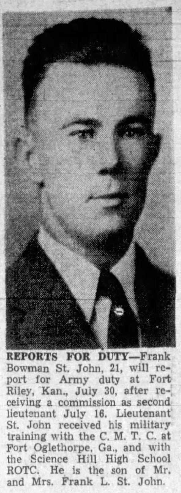 Frank was the son of Frank Love St. John and Ellen Rebecca Bowman. Captain Frank Love St. John was a World War I combat veteran having served in France with Company M, 3rd Battalion, 120th Infantry Regiment, 60th Brigade, 30th Division (Old Hickory), United States Army.