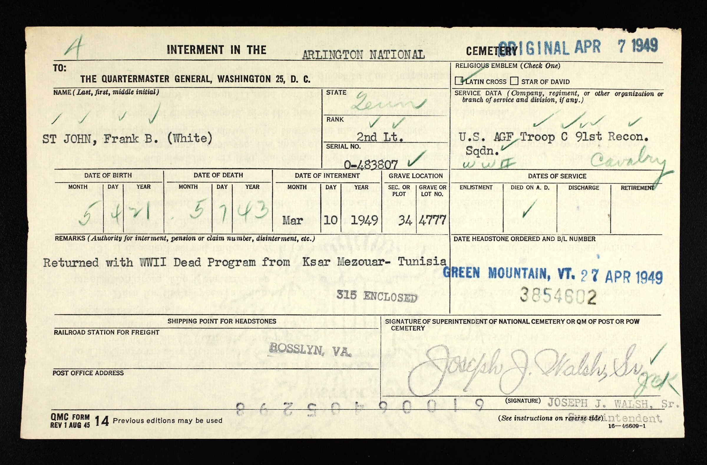 Second Lieutenant Frank Bowman St. John, Service Number 0-483807