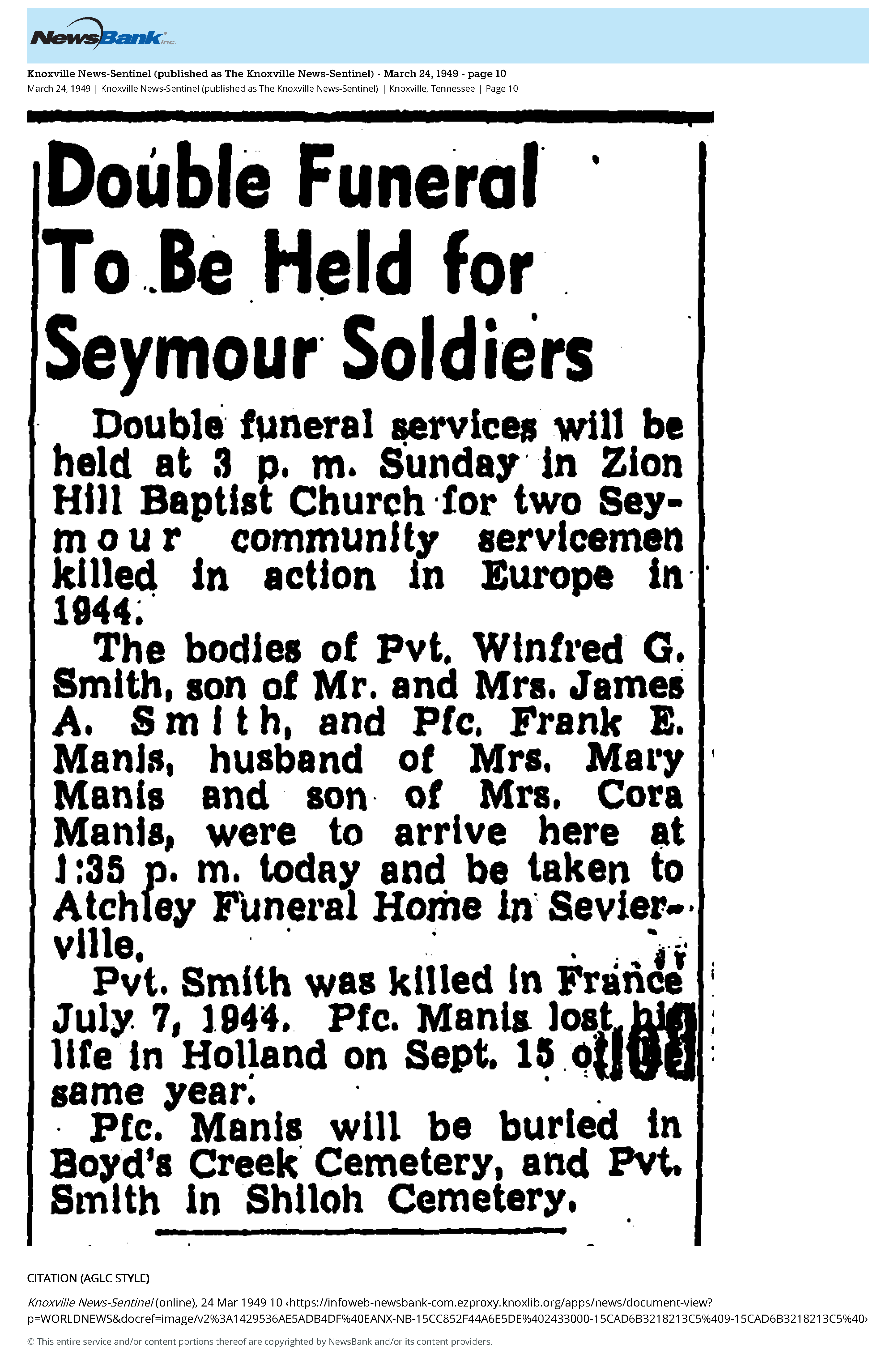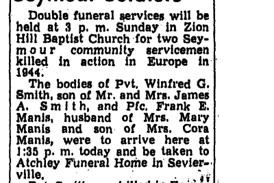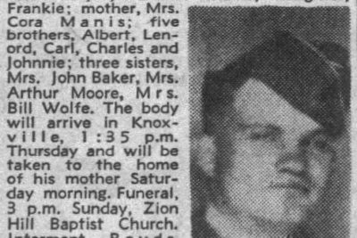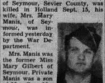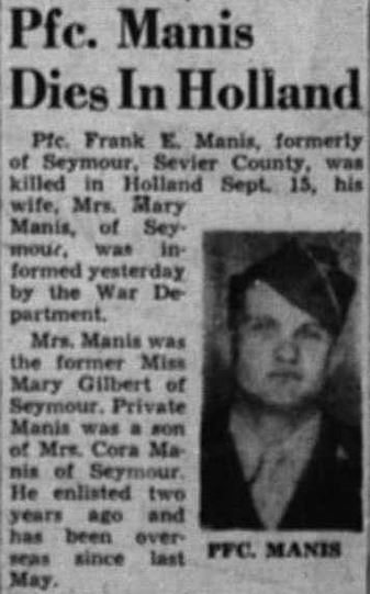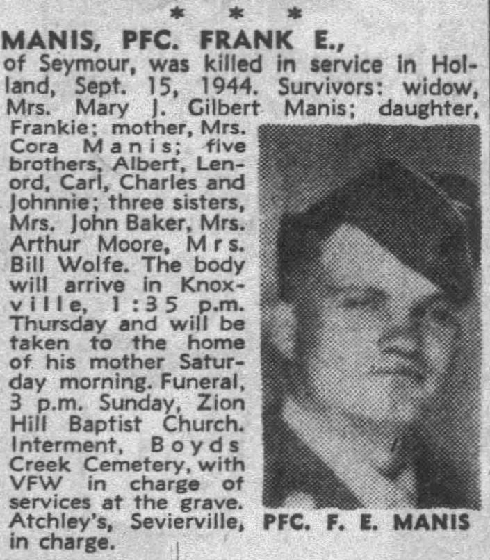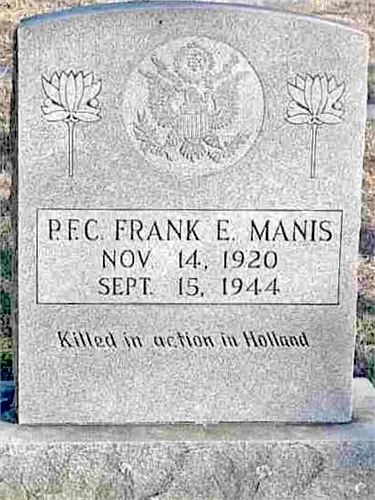 PFC Manis was Killed in Action in Holland on 15 September 1944. He is buried at Boyds Creek Cemetery, Sevier County in Tennessee.