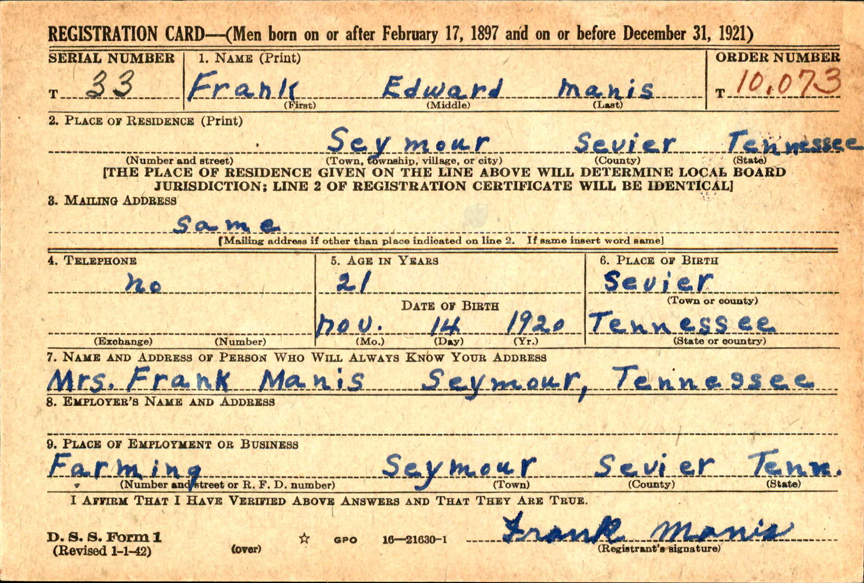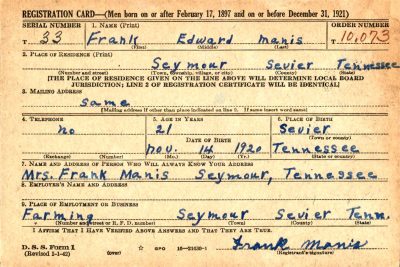 Frank Edward Manis was born on 14 November 1920, the son of Frank Manis and Cora Bell Ammons. Husband of Mary J. Gilbert and father of daughter Frankie.