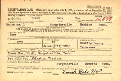 Mr. and Mrs. Frank Noe of Surgoinsville have received word that their son Pfc. Frank Hale Noe, had lost his life on the 17th of May due to accidentally drowning. Pfc. Noe was at the time stationed at a rest camp in Austria. He and two other boys were crossing a River when the boat they were using capsized, according to information received by the parents. He had been in the service since April 7, 1944 and had been overseas since January of this year. He was 19 years of age and was a resident of Surgoinsville, Rt. 1.