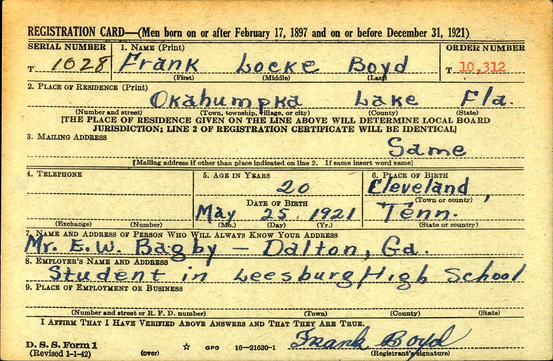 Frank Locke Boyd was born on 25 May 1921, the son of Franklin Locke Boyd and Audith Lee Bagby.