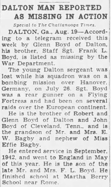 According to a telegram received this week by Glenn Boyd of Dalton, his brother, Staff Sgt. Frank L. Boyd, is listed as missing by the War Department. The young Dalton sergeant was lost while his squadron was on a bombing mission over Hanover, Germany, on July 26. Sgt. Boyd was a rear gunner on a Flying Fortress and had been on several raids over the European continent. He is the brother of Robert and Glenn Boyd of Dalton and John Boyd of Cleveland, Tenn., and is the grandson of Mr. and Mrs. E.W. Bagby and nephew of Miss Effie Bagby.