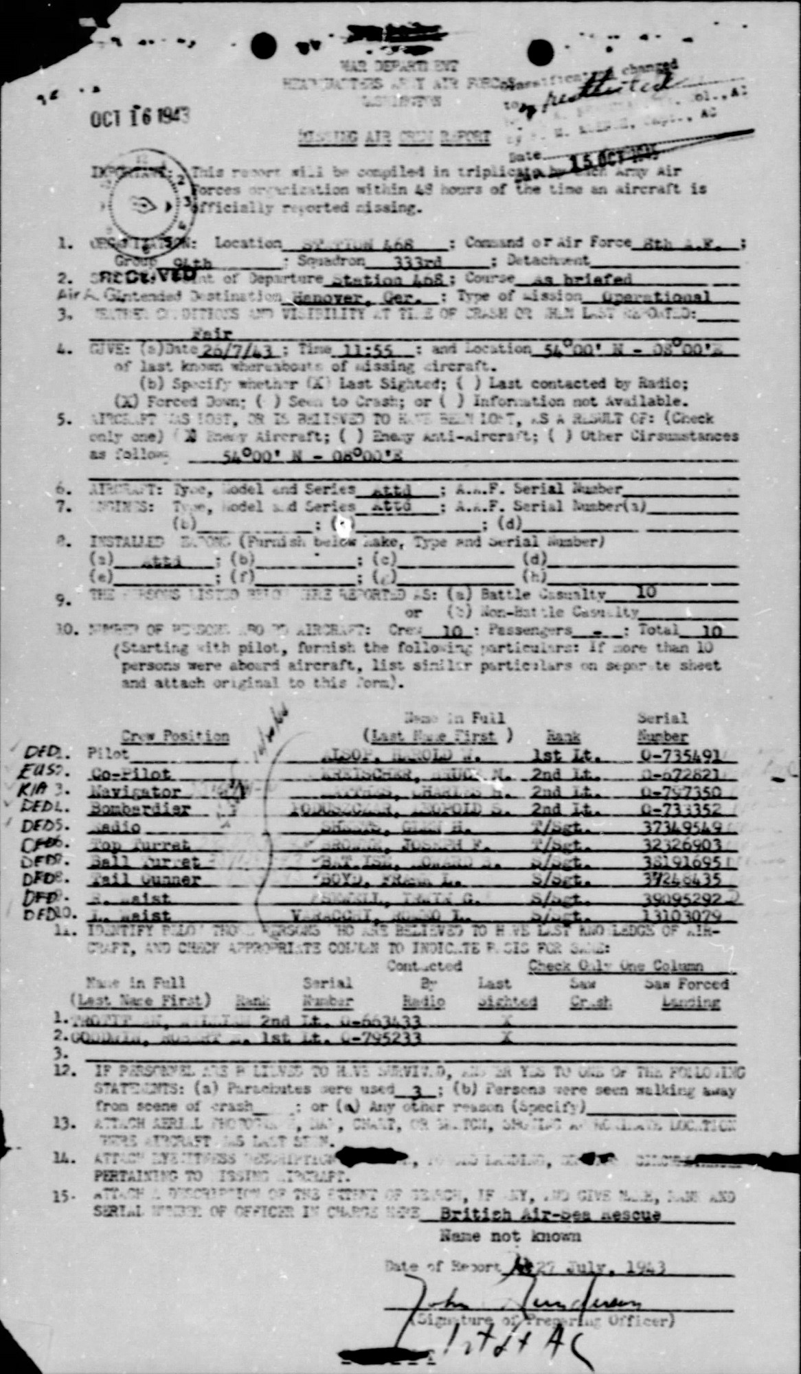 Aircraft B-17F with serial number 42-3280 was on an operational mission to Hanover, Germany. The aircraft crashed at sea near Denmark.