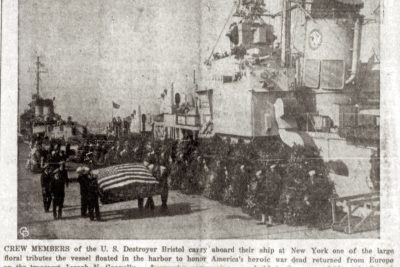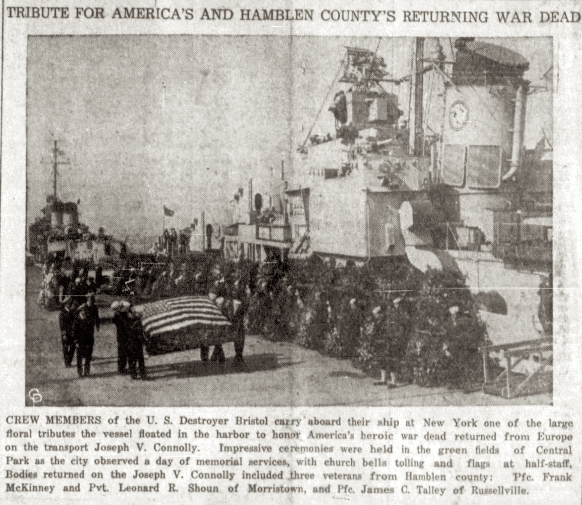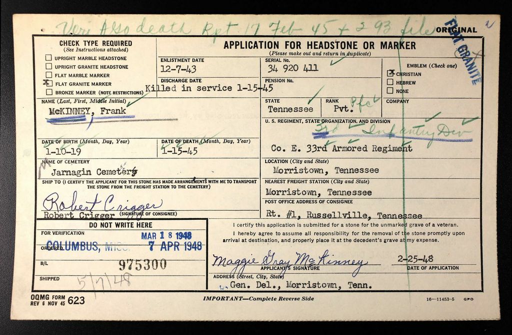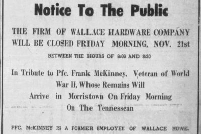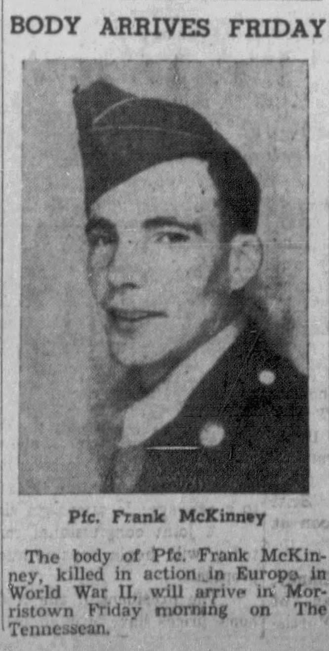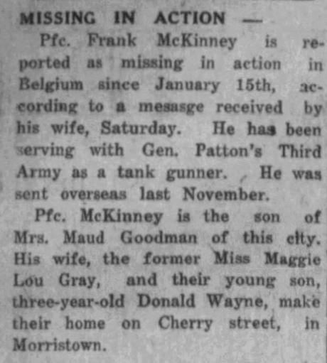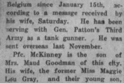 Pfc. Frank McKinney was killed in action in Belgium on Jan. 15th. He was the son of Mr. and Mrs. Clarence Godoman of this city, attended public schools here, and was later employed by Wallace Hdwe. Co. His wife, formerly Miss Maggie Lou Gray, with their three-year-old son Donald Wayne live on Cherry street with her mother, Mrs. Bessie Gray. Four sisters, a brother and a half-brother survive.