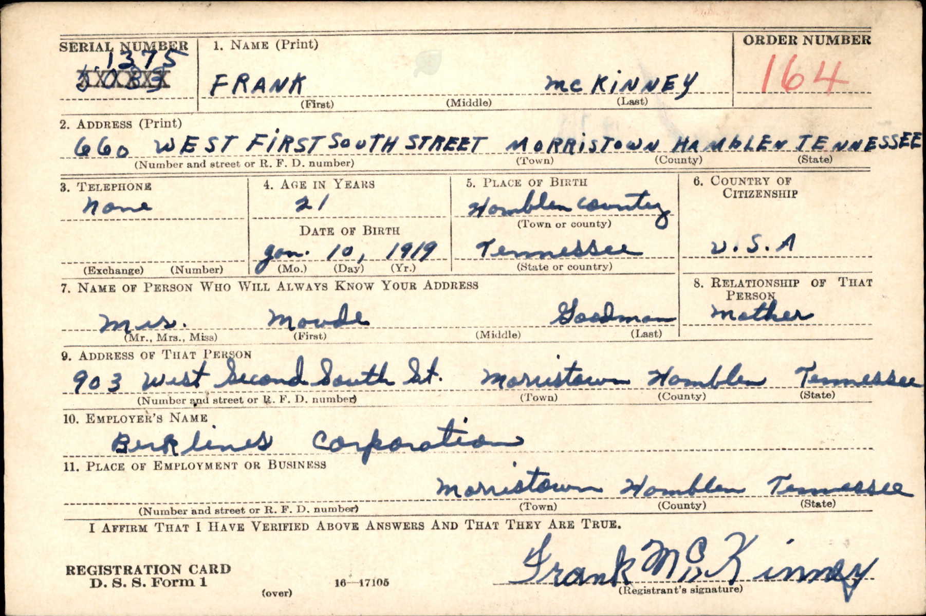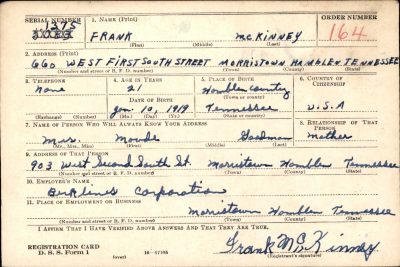 Frank McKinney was born on 10 January 1919, the son of Charles McKinney and Maude Smith. Husband of Maggie Lou Gray and father of Donald Wayne McKinney.