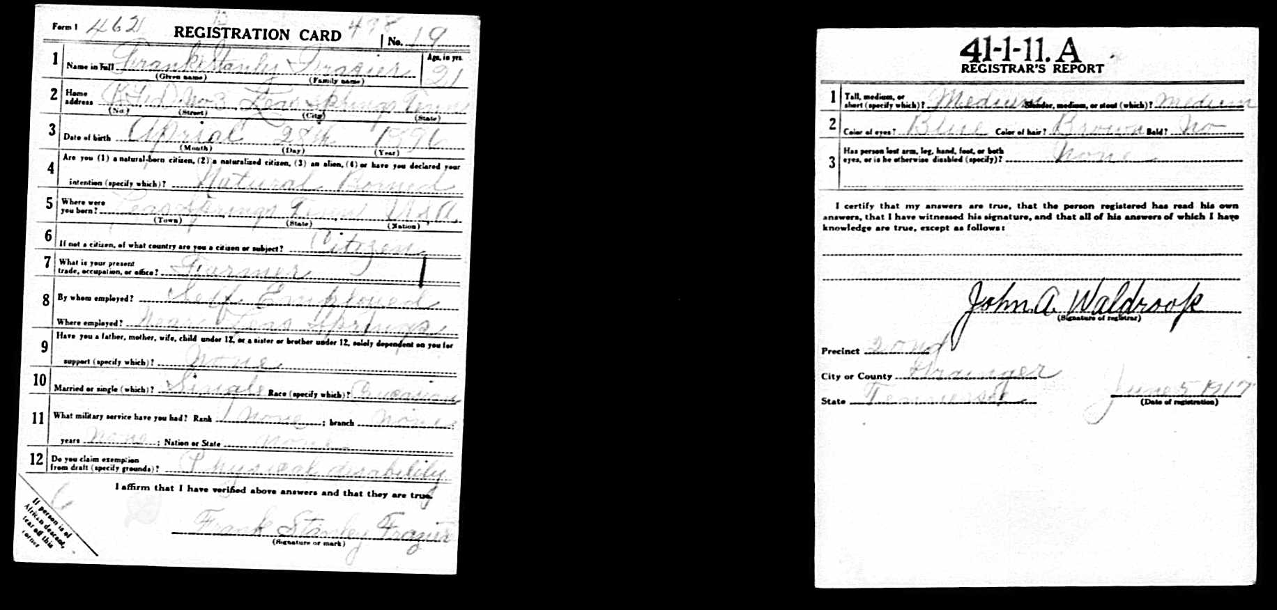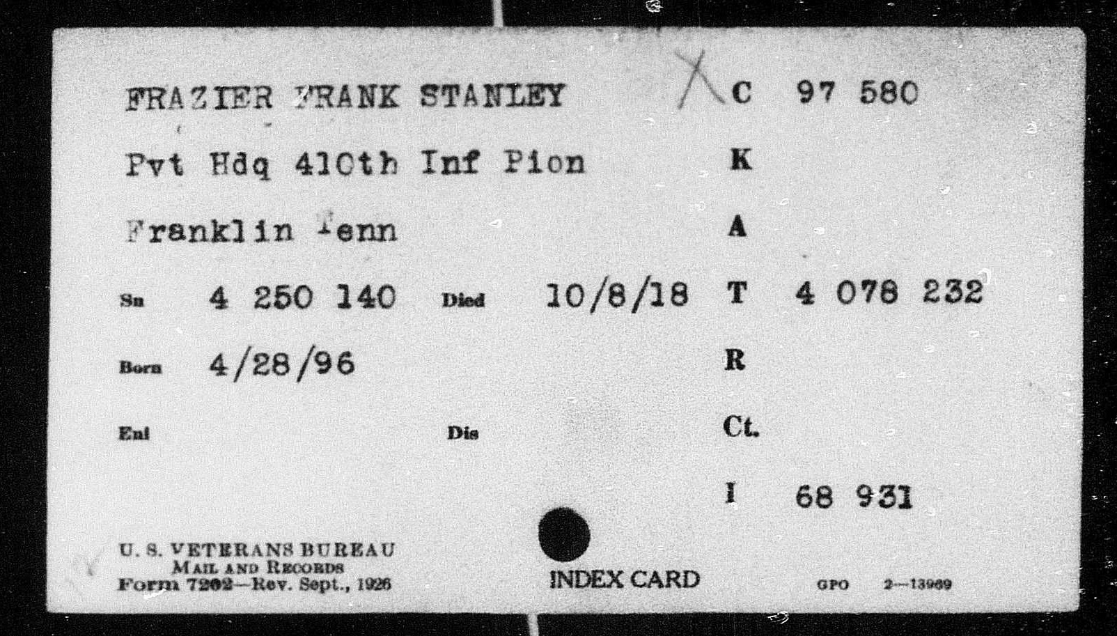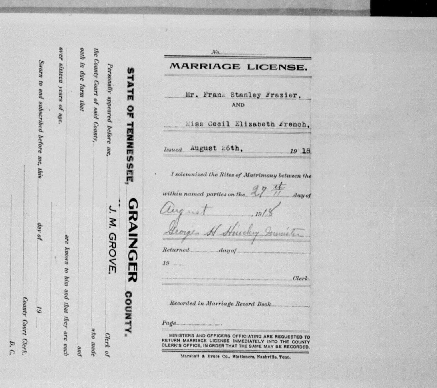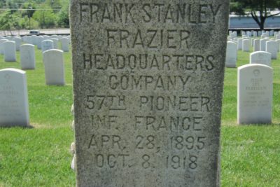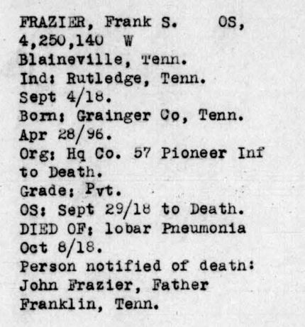 Frank Stanley Frazier was the son of John Frazier and Mattie Ousley. He married Cecil Elizabeth French on 26 August 1918.