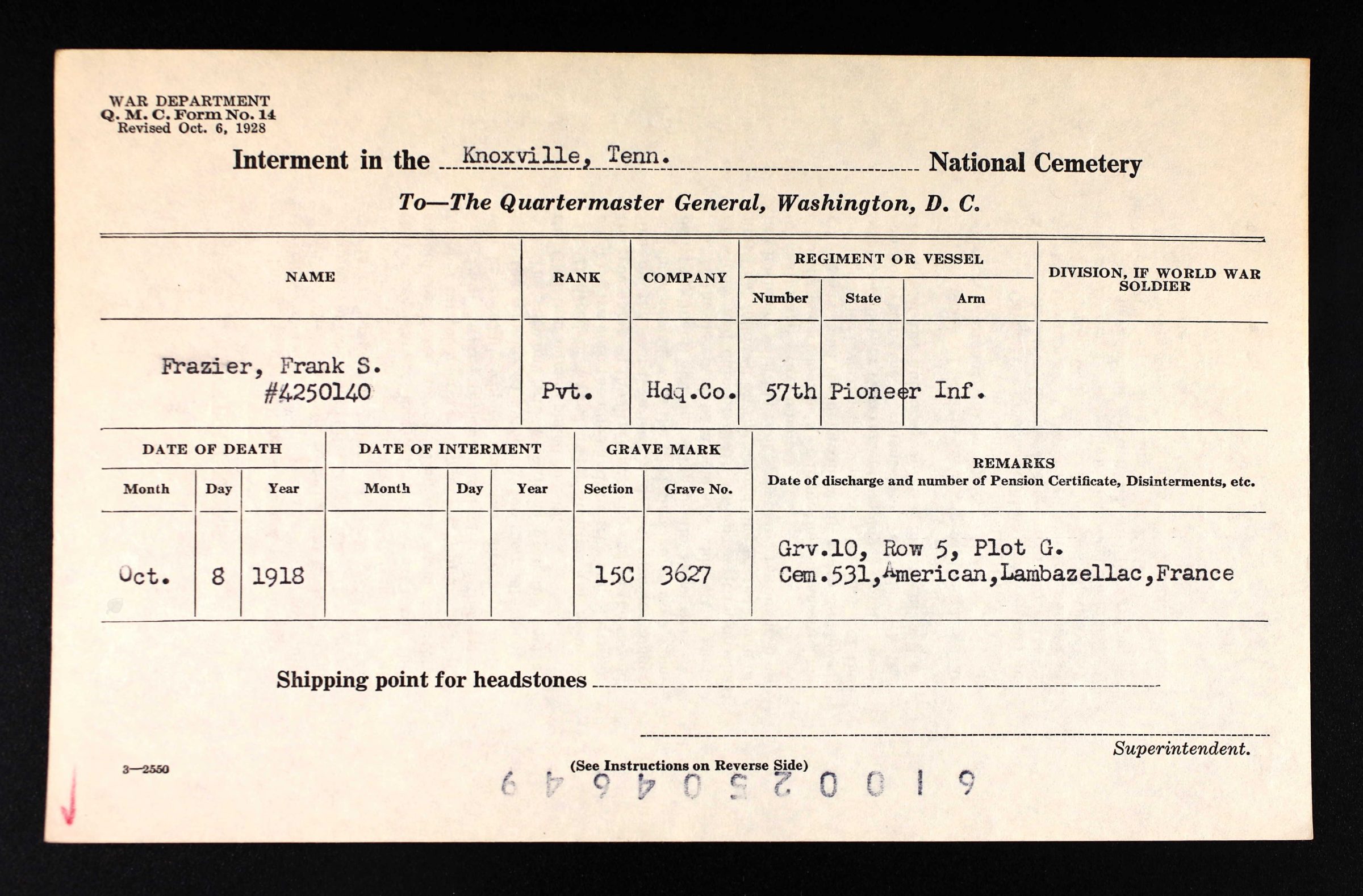 - Division/Assignment: Headquarters Company, 57th Pioneer Infantry Regiment
