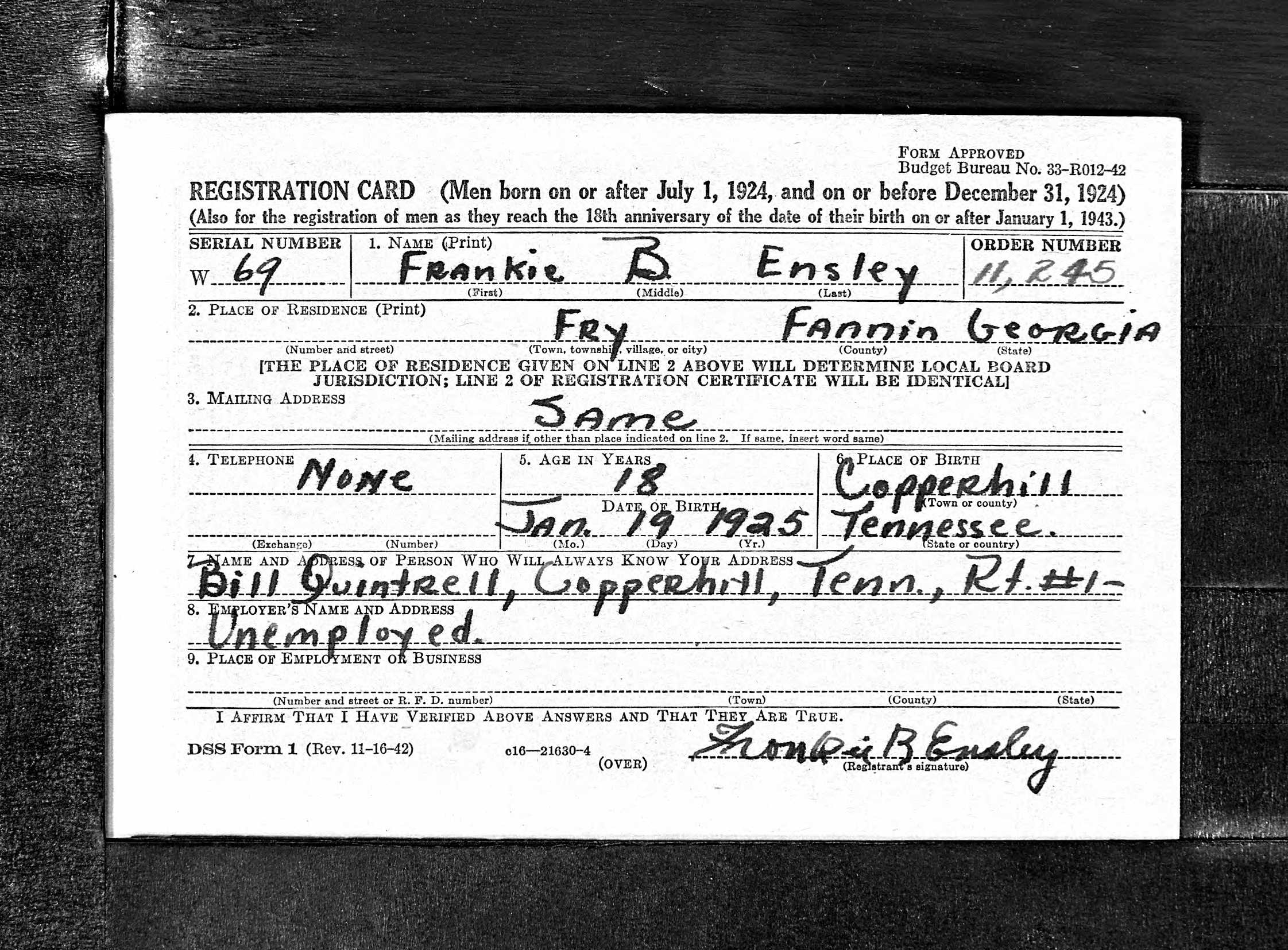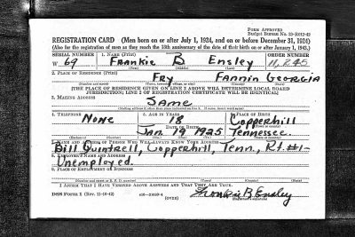 Frankie Ensley was born in Copperhill, Tn., the son of Thomas Murphy Ensley and Ida Beatrice Thomas. He was the husband of Dorothy Lorina Dalton and father of June Marie Ensley.
