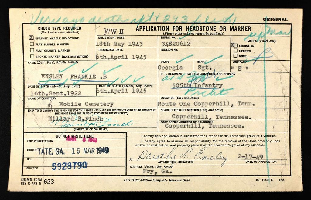 Sergeant Frankie B. Ensley was a assigned to Company E, 505th Parachute Infantry Regiment, 82nd Airborne Division. The division had re-entered Germany on 2 April 1945. He died on 6 April 1945.