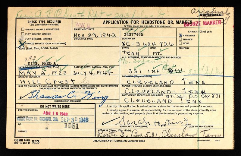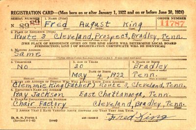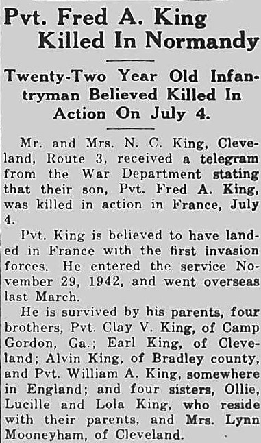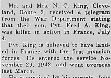 Mr. and Mrs. N.C. King, Cleveland, Route 3, received a telegram from the War Department stating that their son, Pvt. Fred A. King, was killed in action in France, July 4. Pvt. King is believed to have landed in France with the first invasion forces. He entered the service November 29, 1942, and went overseas last March.