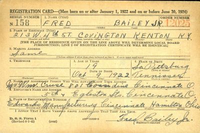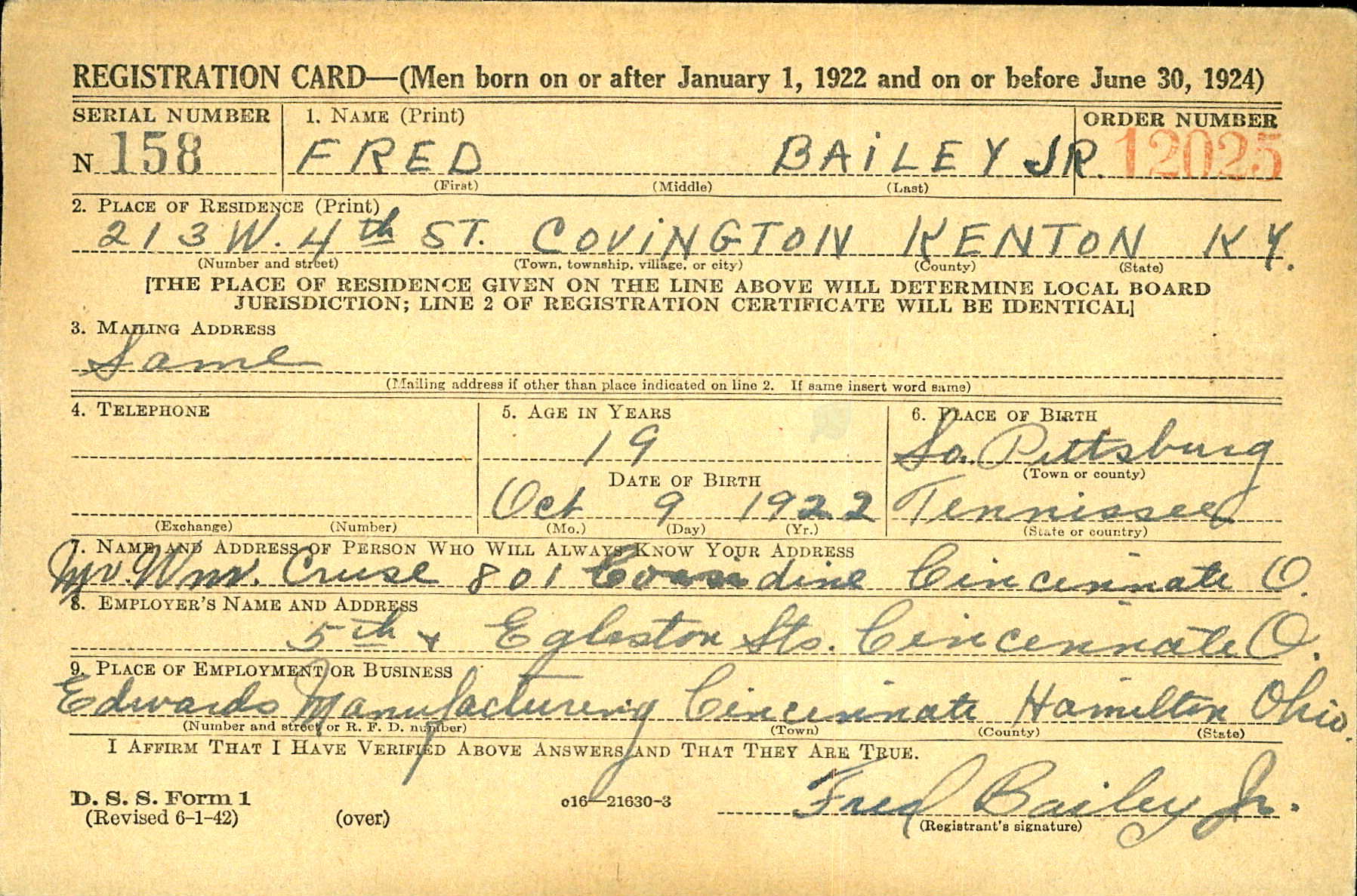 Fred Bailey Jr. was born on 9 October 1922 in South Pittsburgh, Tennessee to Fred Bailey Sr. and Eunnie L. Byron. He was the husband of Edith Bailey.