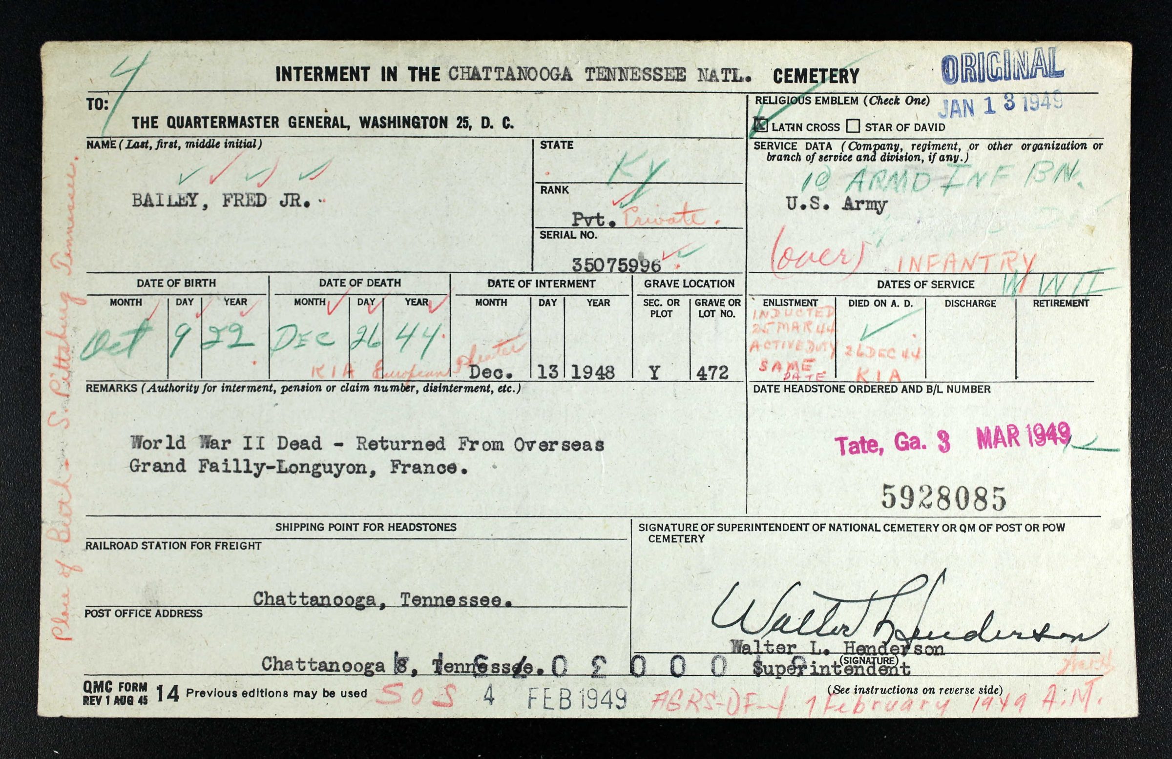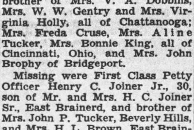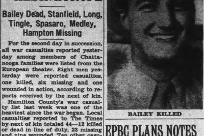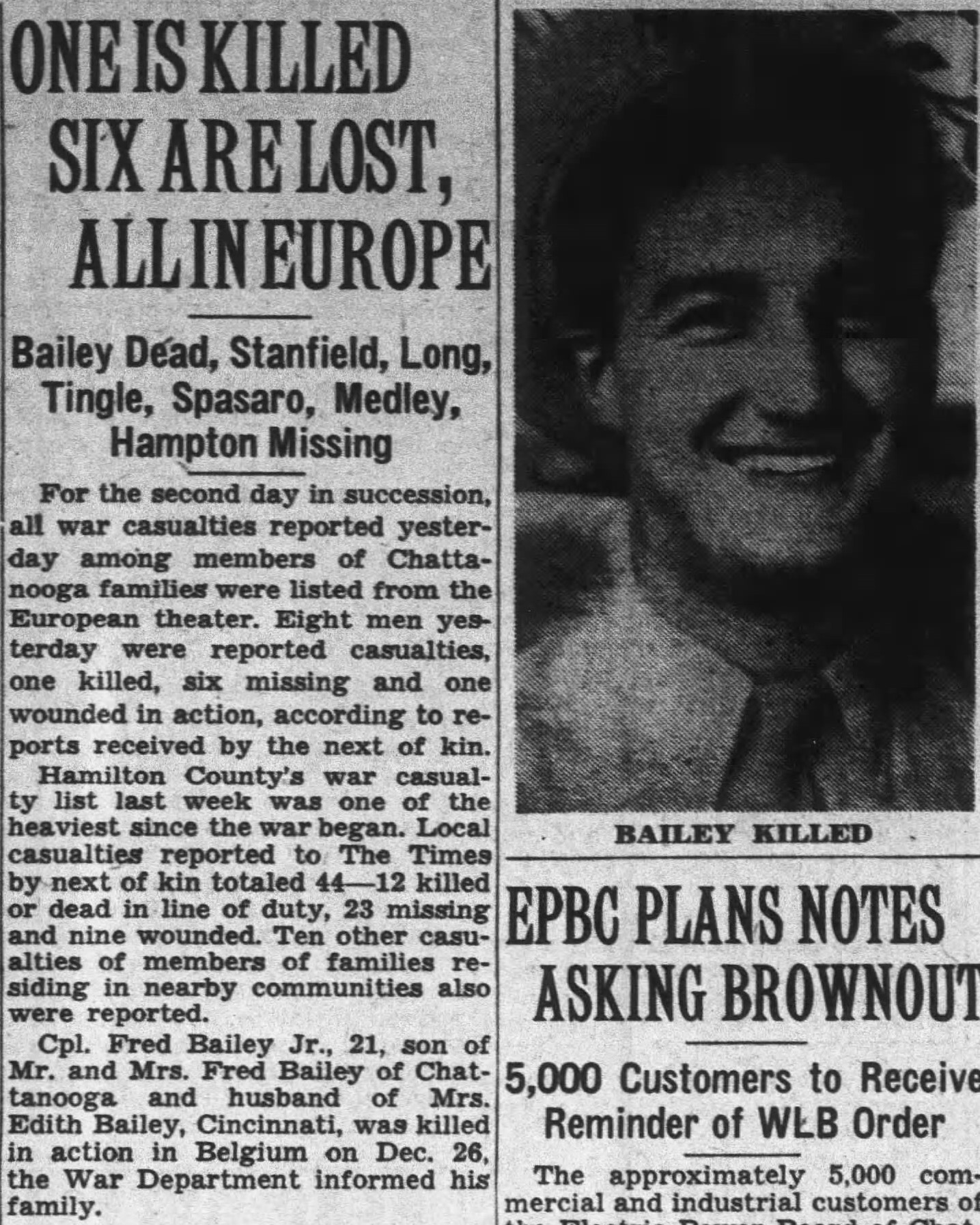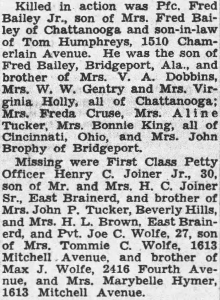 Killed in action was Pfc. Fred Bailey Jr., son of Mrs. Fred Bailey of Chattanooga and son-in-law of Tom Humphreys, 1510 Chamberlain Avenue. He was the son of Fred Bailey, Bridgeport, Ala., and brother of Mrs. V.A. Dobbins, Mrs. W.W. Gentry and Mrs. Virginia Holly, all of Chattanooga; Mrs. Freda Cruse, Mrs. Aline Tucker, Mrs. Bonnie King, all of Cincinnati, Ohio and Mrs. John Brophy of Bridgeport.