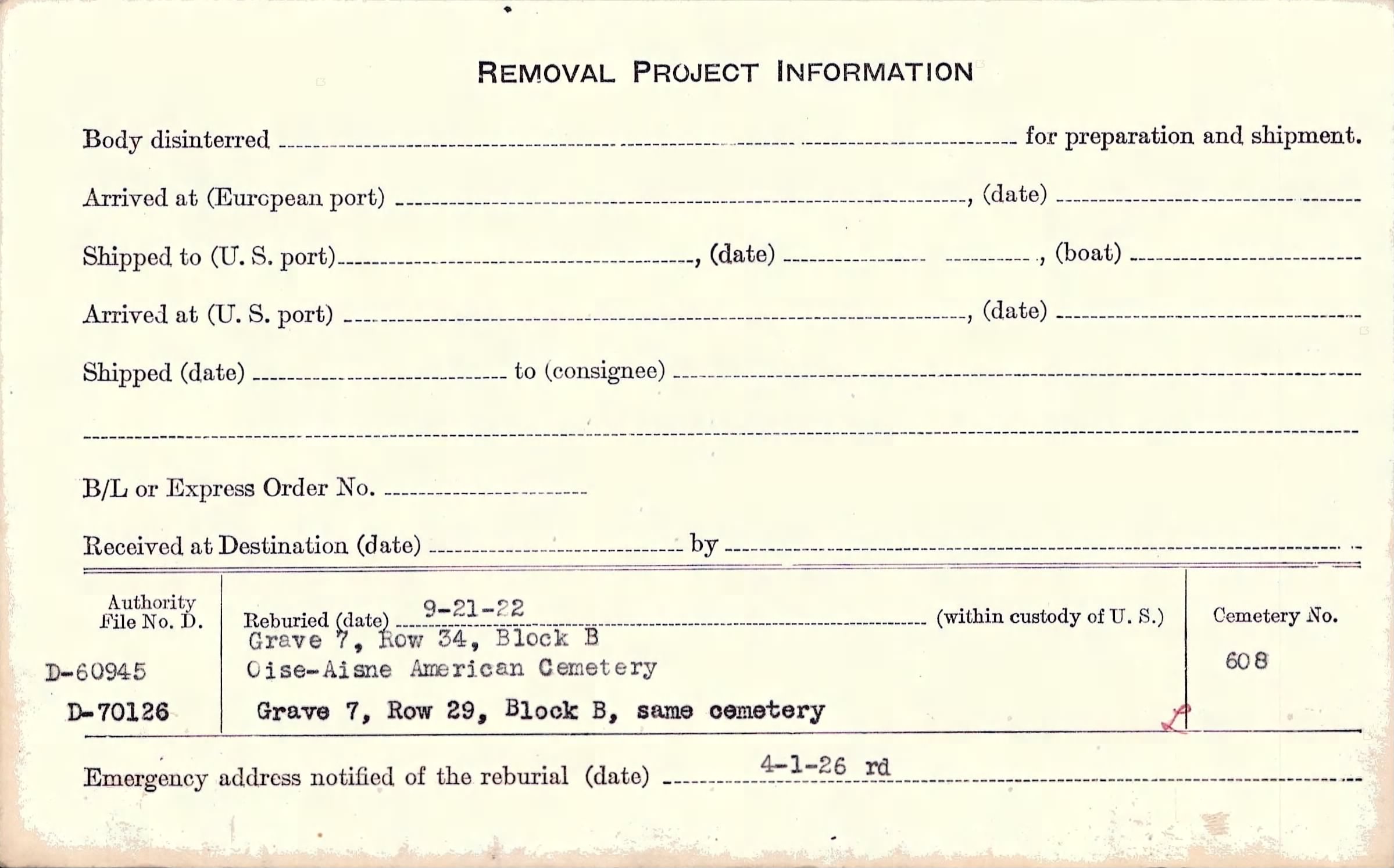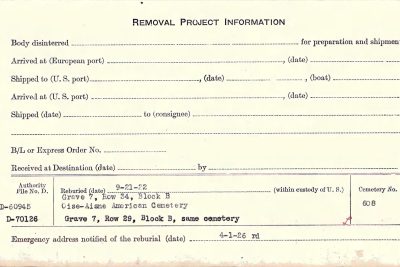 - Burial/Memorial Location: Oise-Aisne American Cemetery, Fere-en-Tardenois, Picardie, France