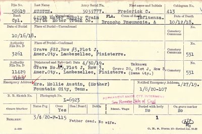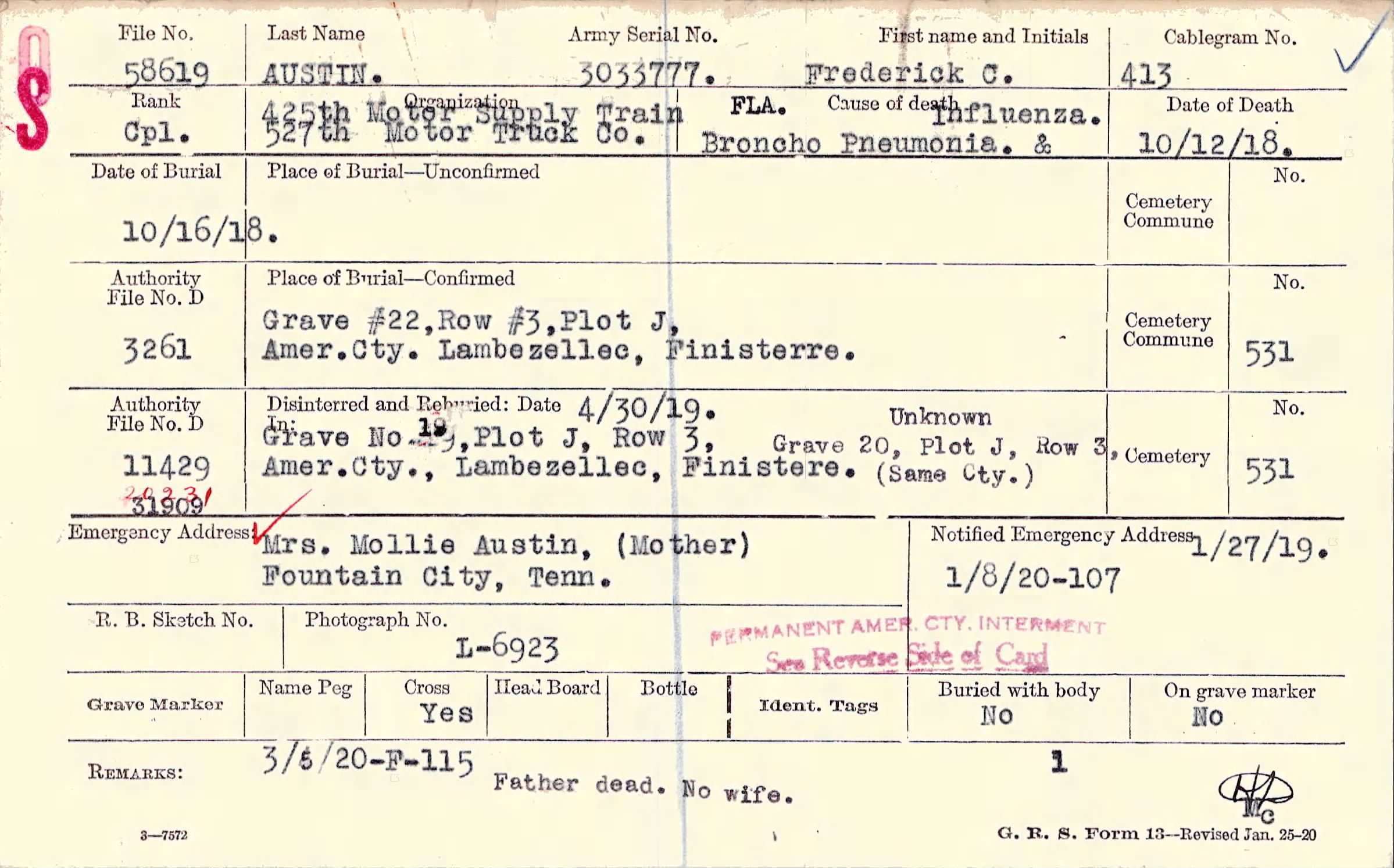 After enlistment in June 1918, was sent to Camp Johnston in Florida as a member of Motor Truck Company No. 527. He was taken ill on the boat, which sailed September 28, 1918, for France, and died just before its arrival. He was buried at Lambezellec, Finistere, France.