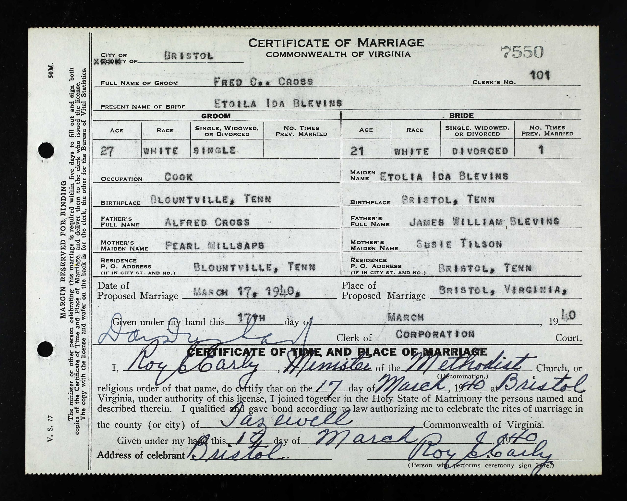 Fred Columbus Cross was born on 25 March 1912 in Blountville, Tennessee. He was the son of William Alfred Cross and Rebecca Pearl Milsap. He was married to Etoila Ida Blevins and father of Fred. C. Cross.
