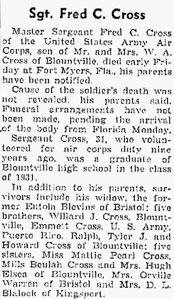 In addition to his parents Mr. and Mrs. W.A. Cross, survivors include his widow, the former Entola Blevins of Bristol: five brothers, Willard J. Cross, Blountville, Emmett Cross, U.S. Army, Puerto Rico, Ralph, Tyler J. and Howard Cross of Blountville: five sisters, Miss Mattie Pearl Cross, Mills Beulah Cross and Mrs. Hugh Elsea of Blountville, Mrs Orville Warren of Bristol and Mrs. D.L. Blalock of Kingsport.