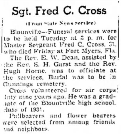 Blounville – Funeral service were to be held for Master Sergeant Fred C. Cross, 31, who died Friday at Fort Myers, Florida.