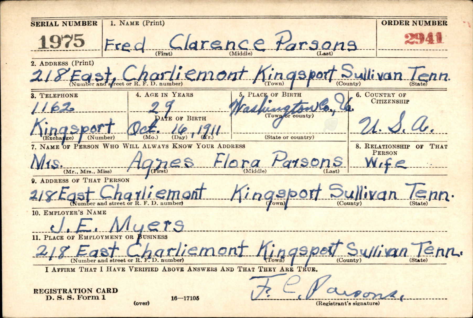 Fred Clarence Parsons was born in Washington County, Virginia, the son of William J. Parsons and Lillie Kathlene Moore. Husband of Winnie Ellen Smith.