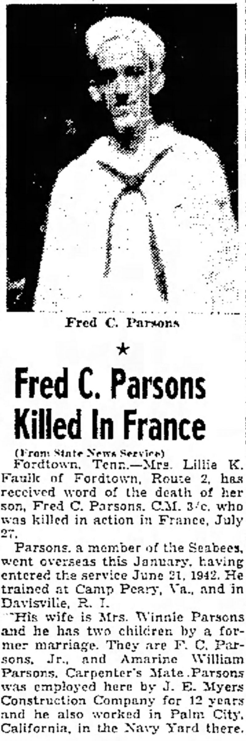 Killed in France Fordtown, Tenn. – Mrs. Lillia K. Faulk of Fordtown, Route 2, has received word of the death of her son, Fred C. Parsons, C.M. 3/c who was killed in France, July 27. Parsons, a member of the Seabees, went overseas this January having entered the service June 21, 1942. He trained at Camp Peary, Va., and in Davisville, R.I. His wife is Mrs. Winnie Parsons, and he has two children by a former marriage. They are the sons Fred C. Parsons Jr., and Amrine William Parsons. Carpenter´s mate Parsons was employed here by J.E. Myers Construction Company for 12 years and he also worked in Palm City, California in the Navy Yard there.
