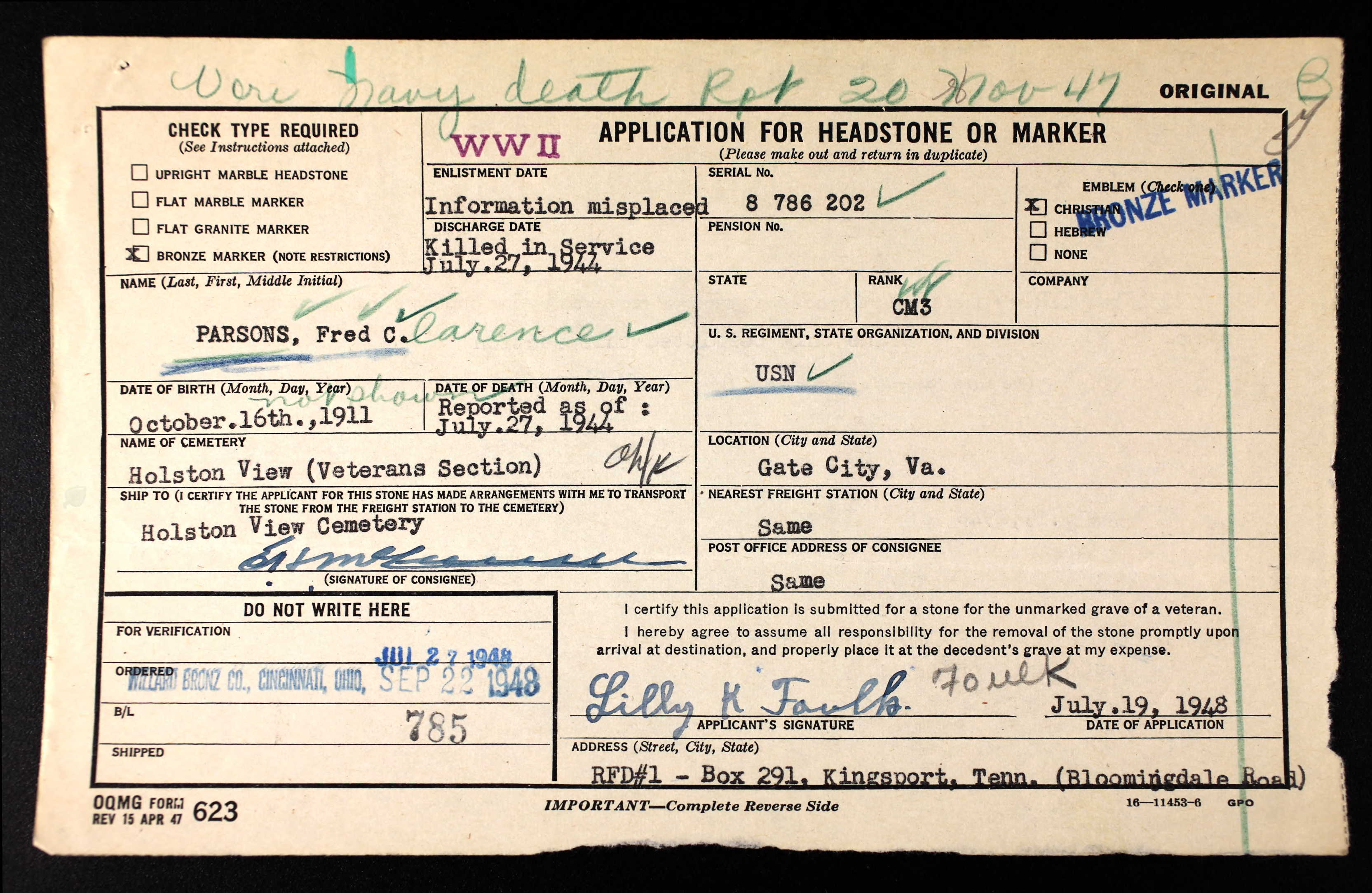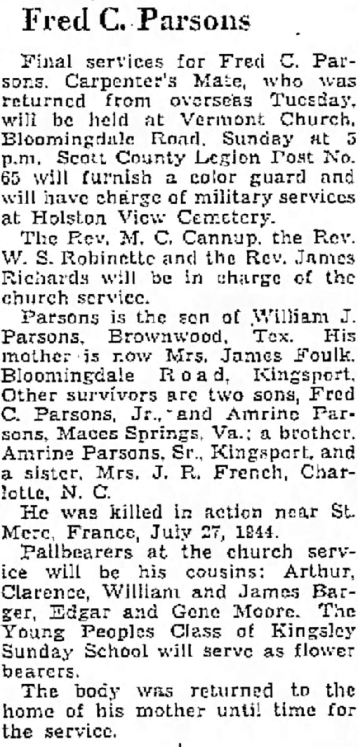 Hilton – The body of Fred C. Parsons, 3-c Carpenters Mate who lost his life July 27, 1944 near St. Mere, France during the European invasion, will arrive at Kingsport Tuesday at 2:35 p.m. Parsons was a native of Washington County, Va., and the son of the late William J. Parson of Brownwood, Texas. His mother was Miss Lilly Moore before her marriage ot Mr. Parsons and is now Mrs. James Faulk, Bloomingdale Road, Kingsport. Other immediate survivors, are his widow, the former Agnes Clark of Mace Springs, VA., two sons, F.C. and Amrine Parsons, both of Hiltons, a brother Amrine Parsons Sr., Kingsport; a sister, Mrs. Dana McNeal, Charlotte N.C. Parsons was educated in the Coeburn, Va.; Bristol, Tenn.; and Bluff City Tenn., schools and before entering military service was employed by J.E. Myers Construction Co., Kingsport for about 12 years. Funeral rites will be held in Mt. Vernon Church, Bloomingdale Road, Kingsport, Sunday July 18. Burial will be in the veterans section, Holston View Cemetery. Legion Post 65 will have charge of the military service.