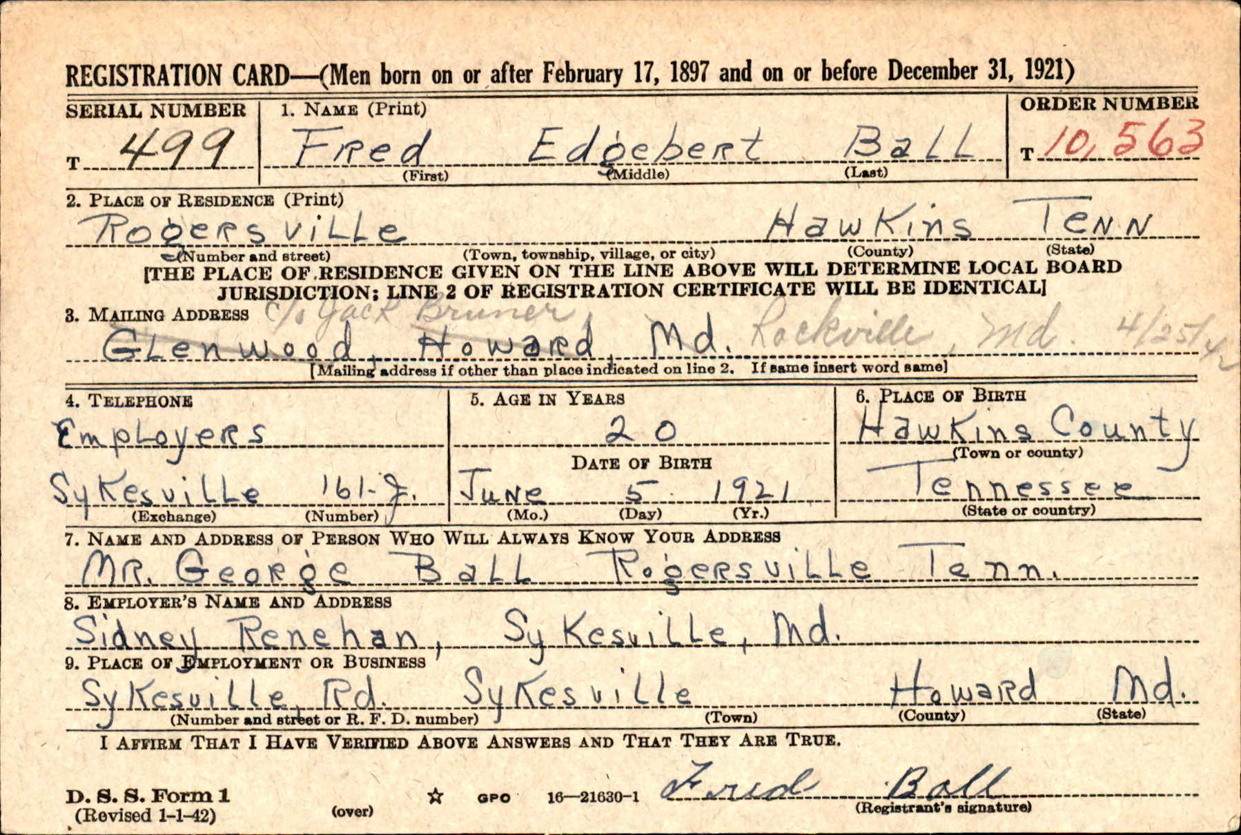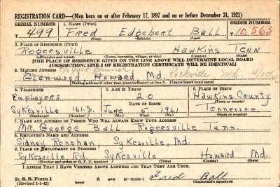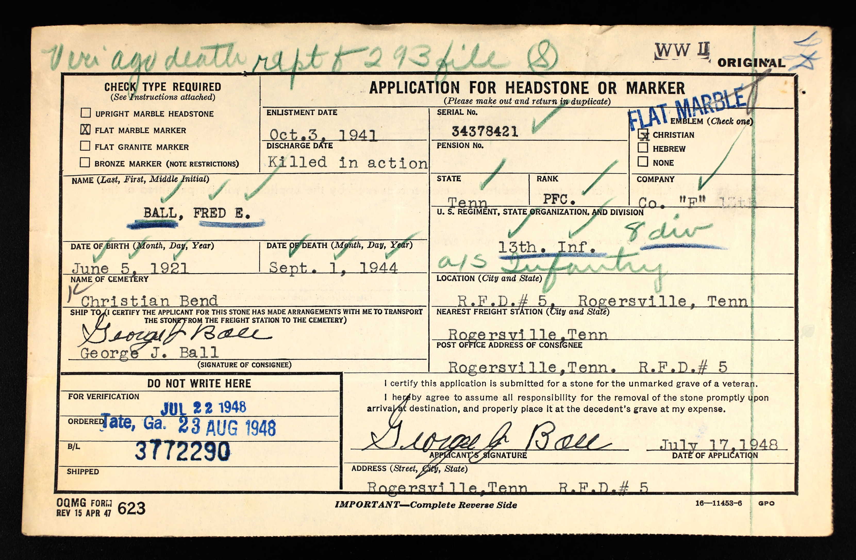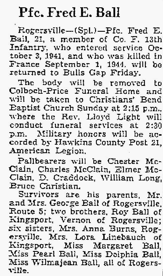 The Germans surrendered the city on 19 September 1944 to the Americans. The Battle of Brest, France resulted in 4,000 US casualties including Fred Ball who was killed on September 1, 1944. The 8th spent a total of 266 days in combat during the war. The 8th was awarded a total of 3 Medal of Honors, 33 Distinguished Service Crosses, and 768 Silver Stars. Fred Ball died at the age of 23. He was buried in Christian Bend Cemetery in Rogersville, TN. Military Service Number 34378421.