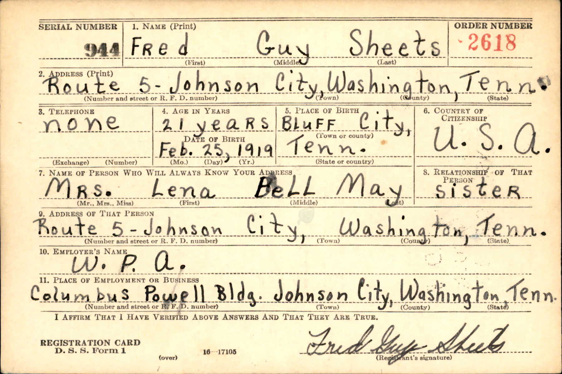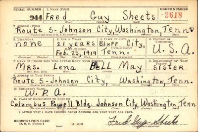 Fred Guy Sheets was born on 25 February 1919 in Bluff City, Sullivan County, Tennessee, the son of Riley William Sheets and Dokie McAllister.