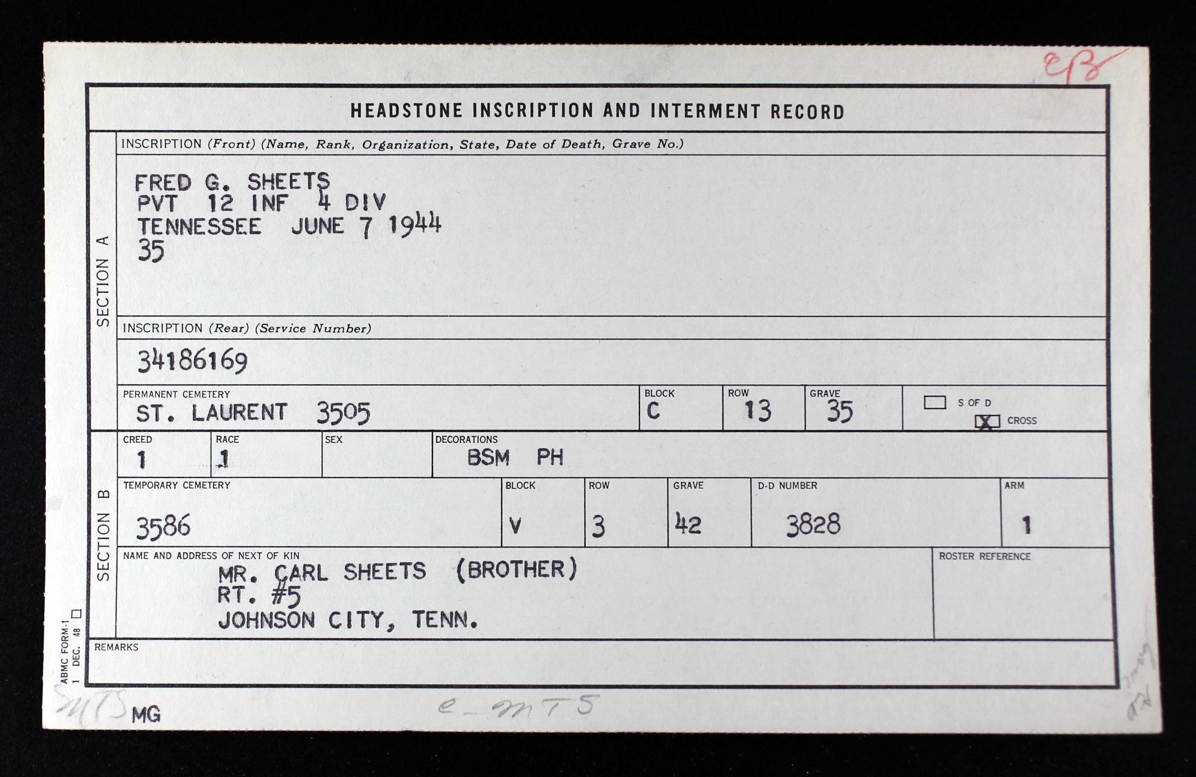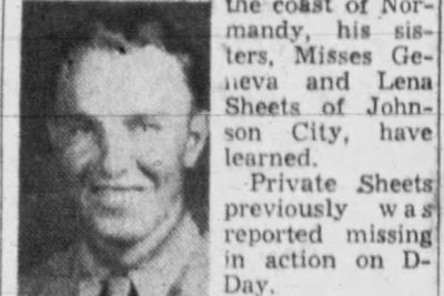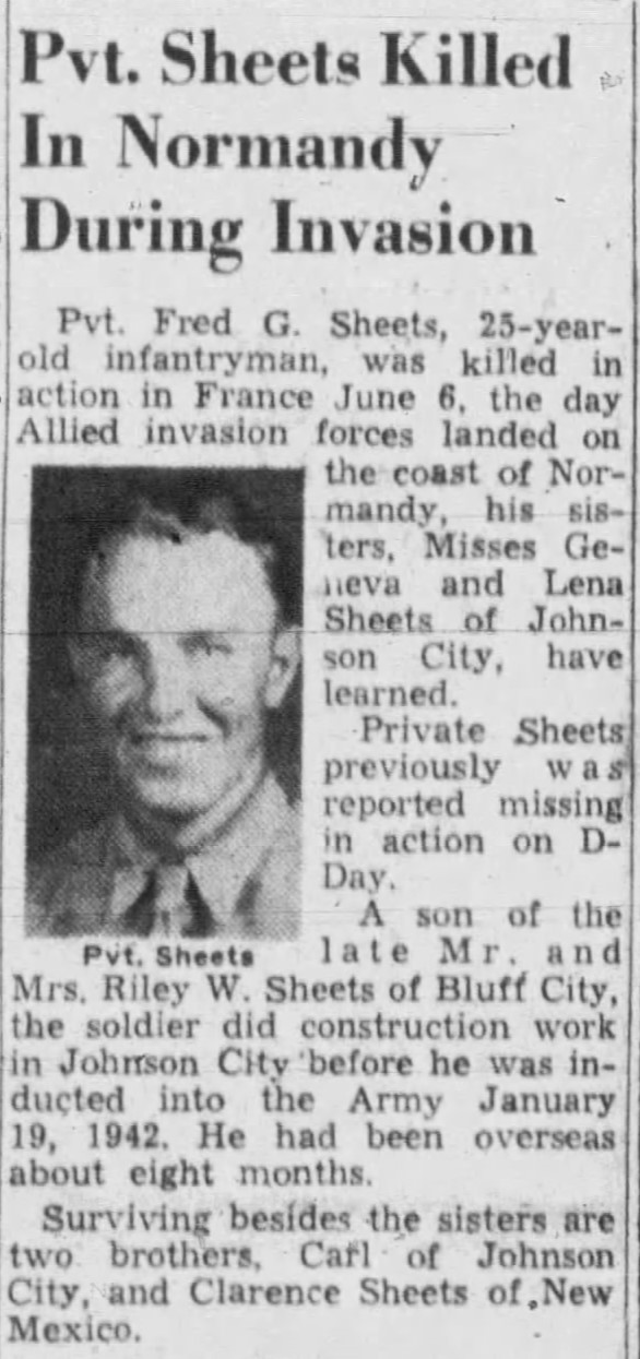 Pvt. Fred G. Sheets, 25-year-old infantryman, was killed in action in France June 6, the day Allied invasion forces landed on the coast of Normandy, his sisters, Misses Geneva and Lena Sheets, have learned. Private Sheets previously was reported missing in action on D-Day. A son of the late Mr. and Mrs. Riley W. Sheets of Bluff City, the soldier did construction work in Johnson City before he was inducted into the Army January 19, 1942. He had been overseas about eight months. Surviving besides the sisters are two brothers, Carl of Johnson City and Clarence Sheets of New Mexico.