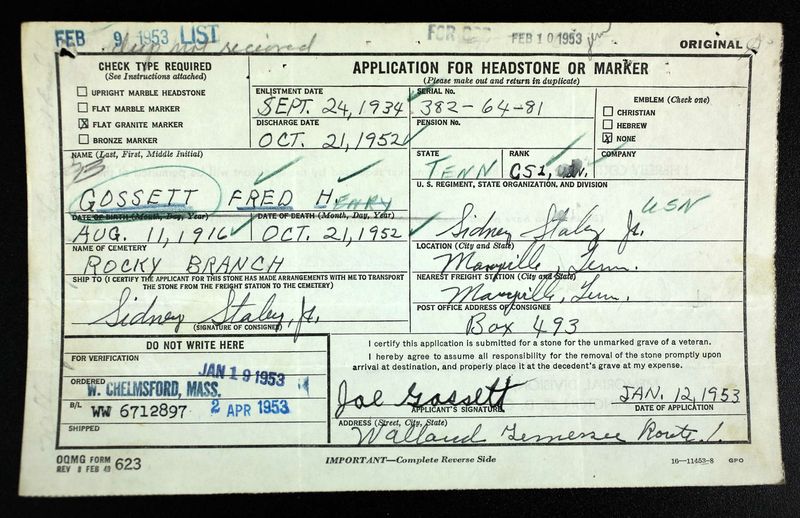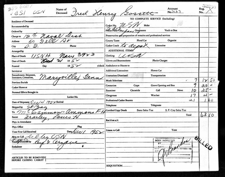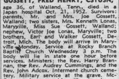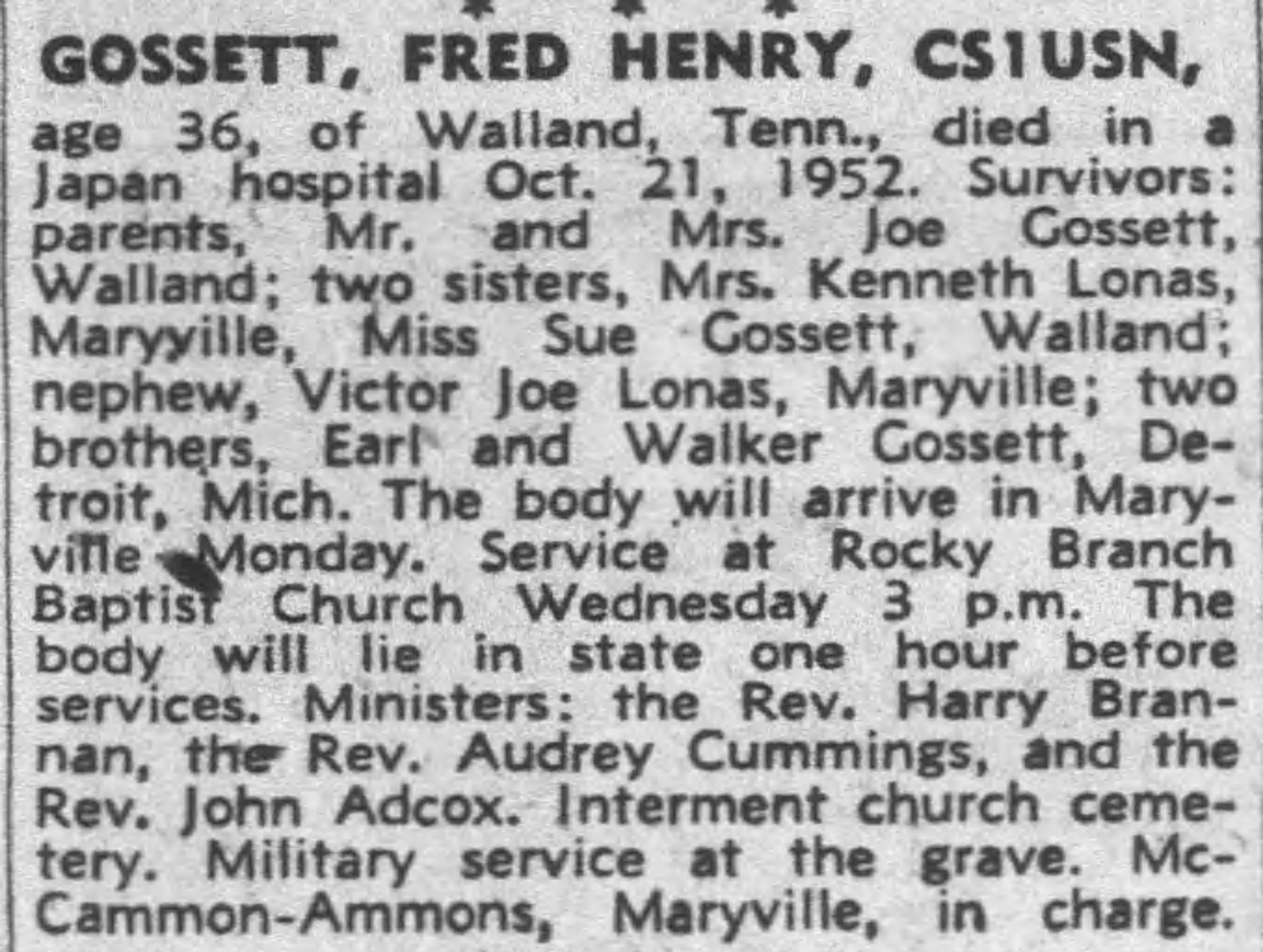 Fred Henry Gossett, Navy Commissionaryman first class, died in a Naval hospital at Yokasuka, Japan. He was a veteran of 16 years in service. At the time of his death he was serving on the Aircraft Carrier U.S.S. Kearsarge. He leaves his parents; two sister, Mrs. Kenneth Lones of Route 7, Maryville and Miss Sue Gossett; two brothers, Earl and Walker, Detroit.