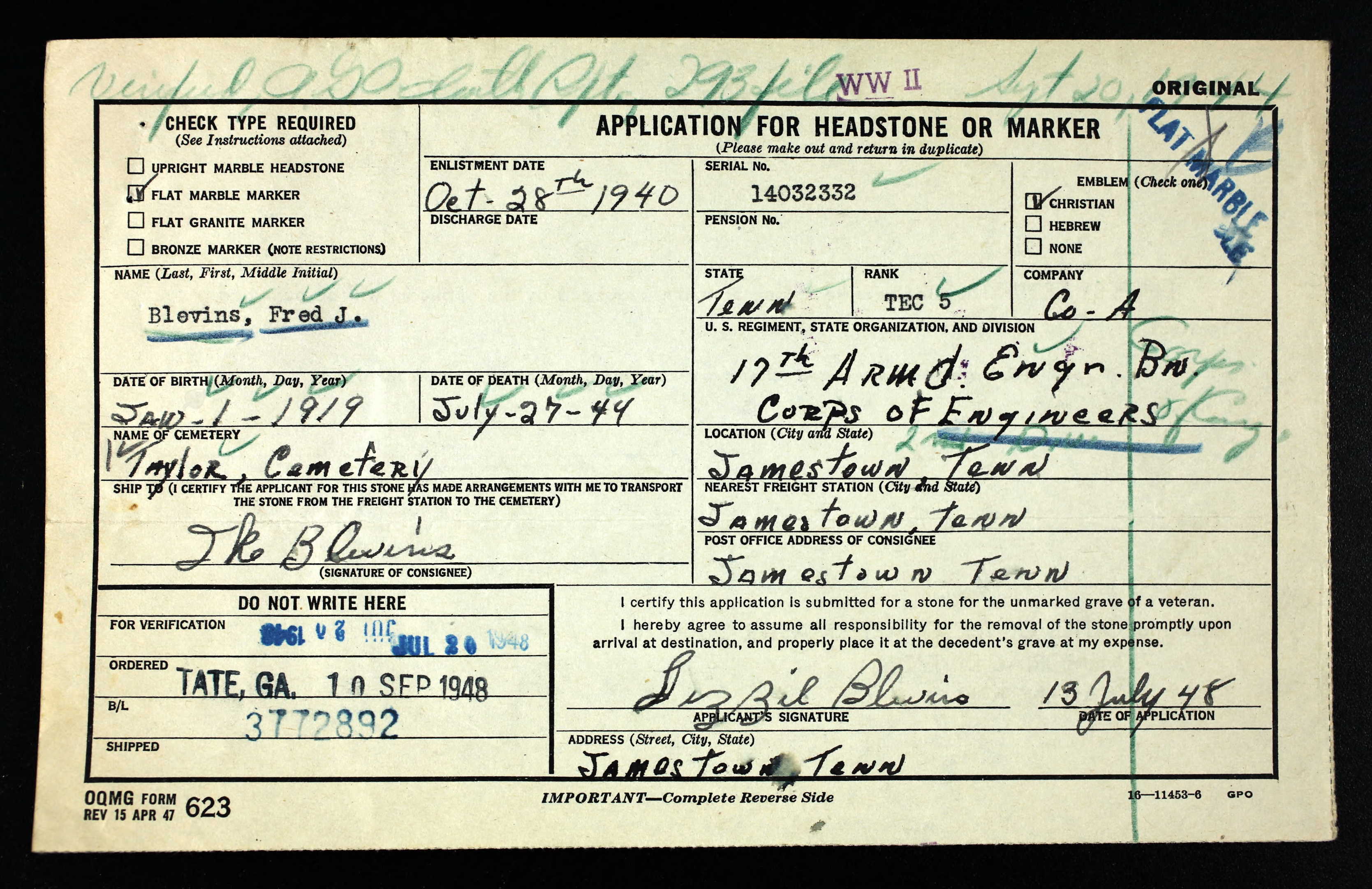 Fred Johnson Blevins was born on 1 January 1919, the son of John “Crum” Blevins and Lizzie Dora Blevins.