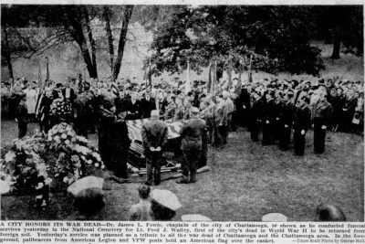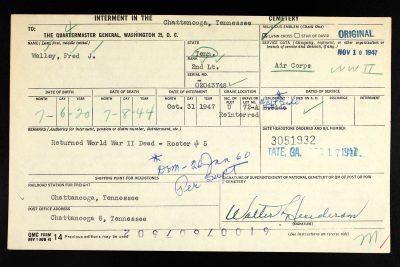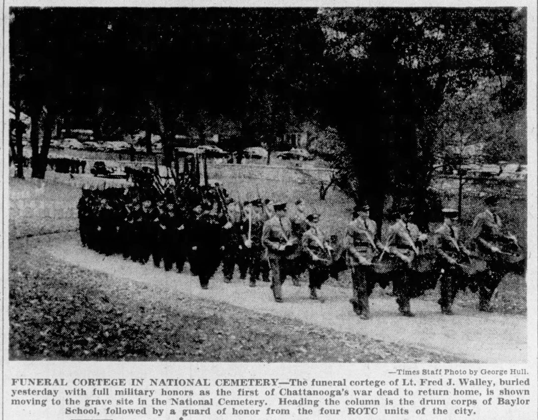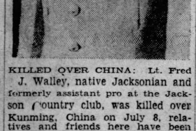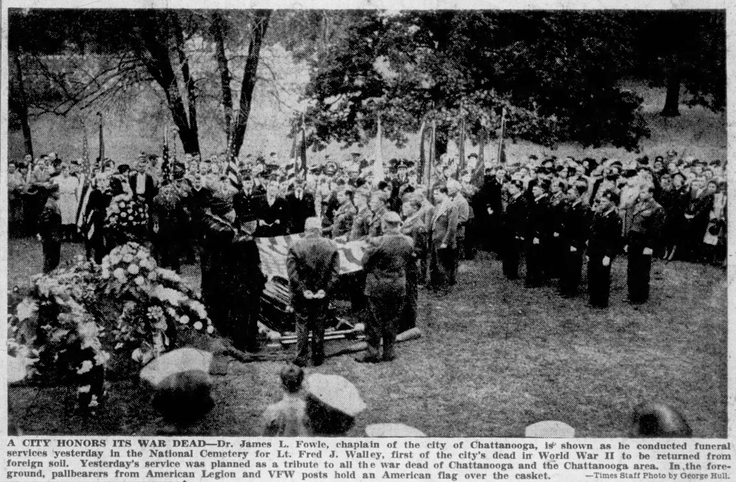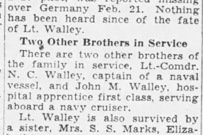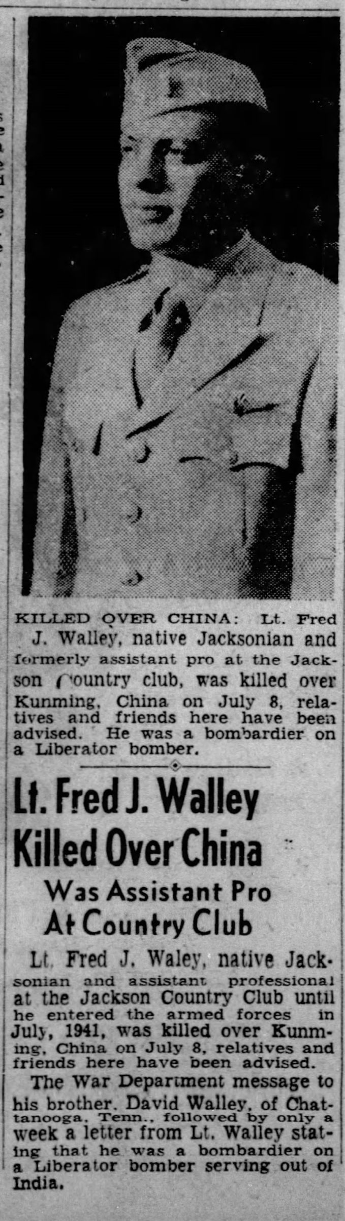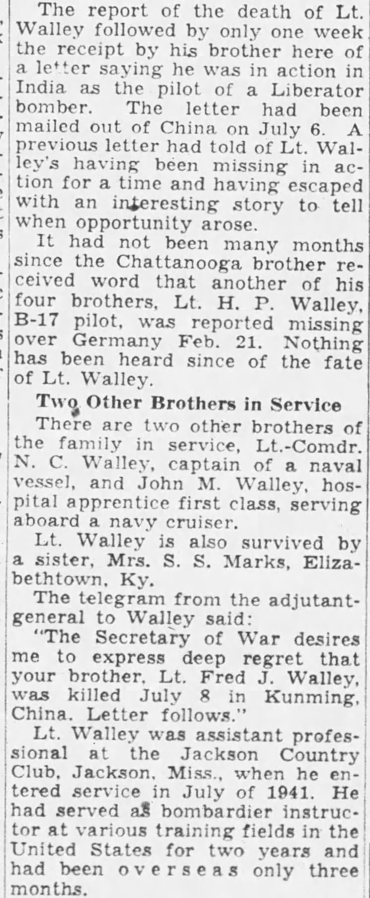 Killed in action was Lt. Fred J. Walley, brother of David Z. Walley, 718 Clayton Avenue. The report of the death of Lt. Walley followed by only one week the receipt by his brother here of a letter saying he was in action in India as the pilot of a Liberator bomber. The letter had been mailed out of China on July 6. A previous letter had told of Lt. Walley’s having been missing in action for a time and having escaped with an interesting story to tell when opportunity arose. It had not been many months since the Chattanooga brother received word that another of his four brothers, Lt. H.P. Walley, B-17 pilot, was reported missing over Germany, Feb. 21. Nothing has been heard since of the fate of Lt. Walley. There are two other brothers of the family in service, Lt.-Comdr. N.C. Walley, captain of a naval vessel, and John M. Walley, hospital apprentice first class, serving aboard a navy cruiser. Lt. Walley is also survived by a sister, Mrs. S.S. Marks, Elizabethton, Ky.