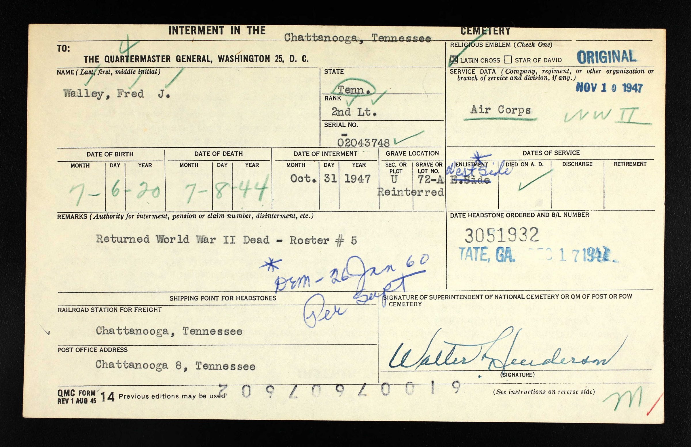 Fred J. Walley was born on 6 July 1920 in Mississippi, to David Walley and Rose Alpert. His father was a Major in the United States Army during World War I and died in 1929. His brother 2nd Lt. Henry P. Walley was killed in action in February 1944 in Germany and is memorialized at Cambridge, England.