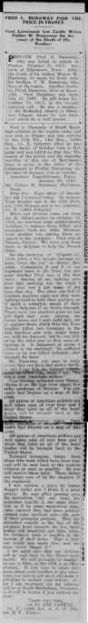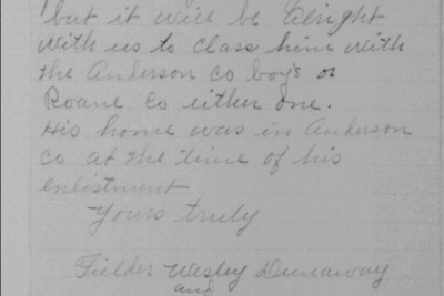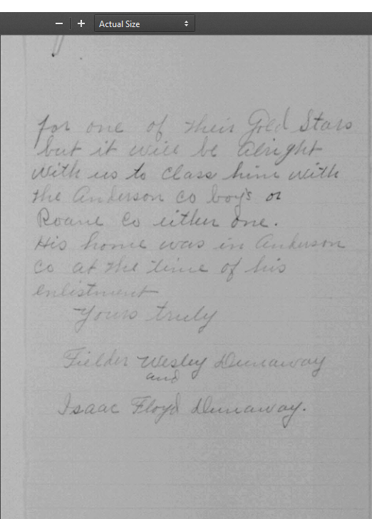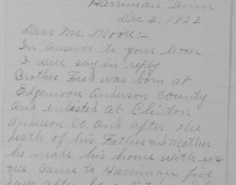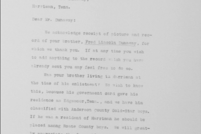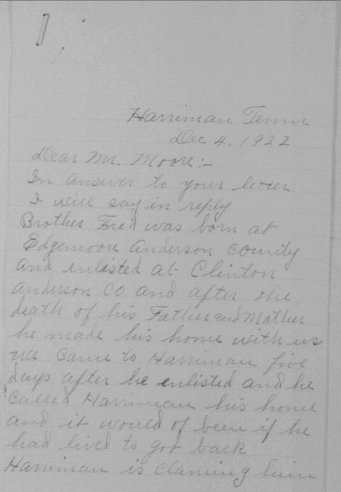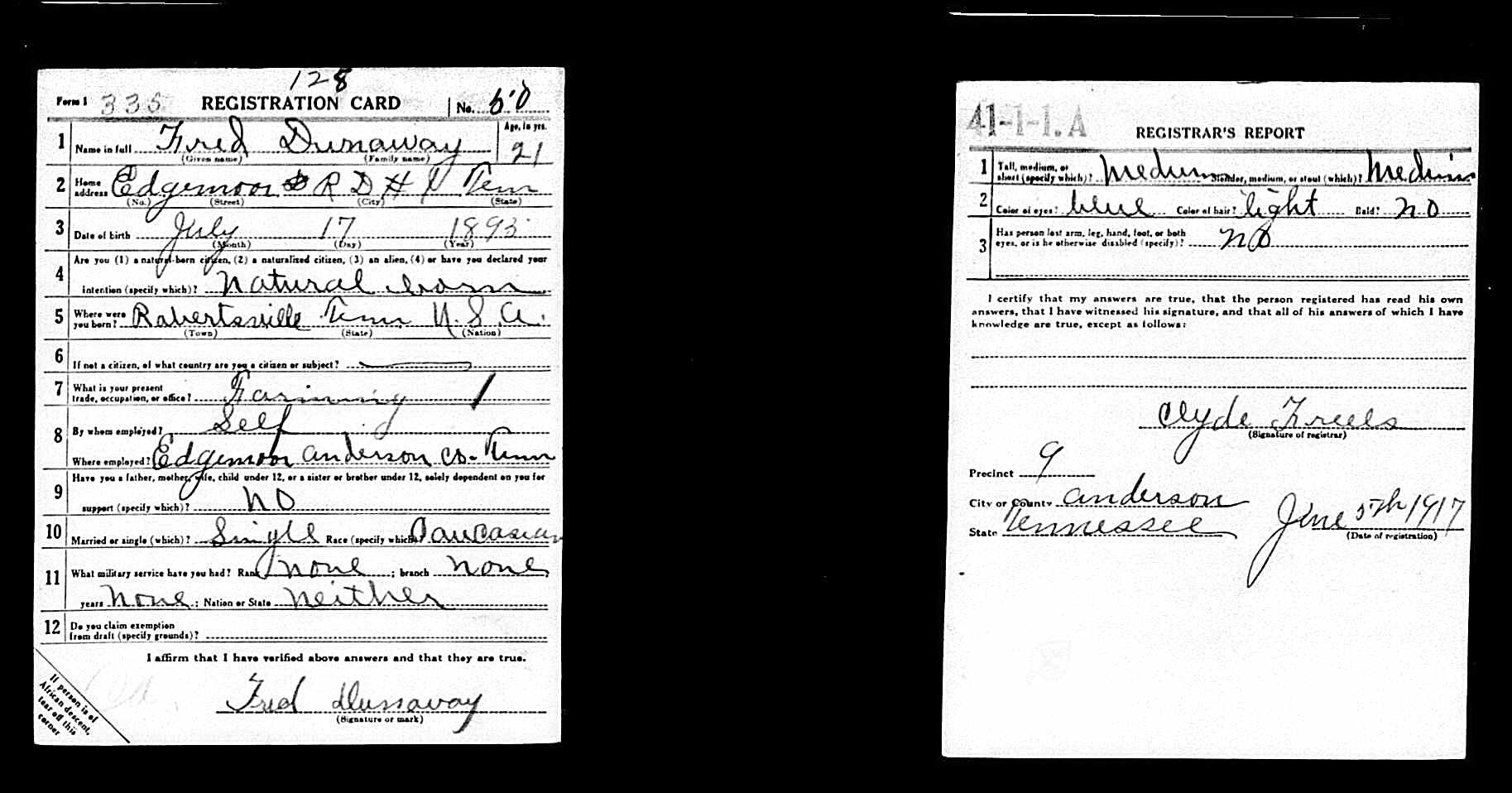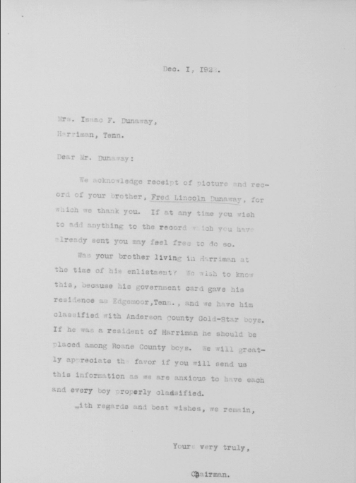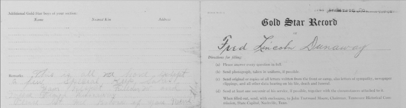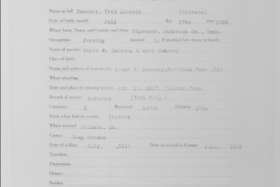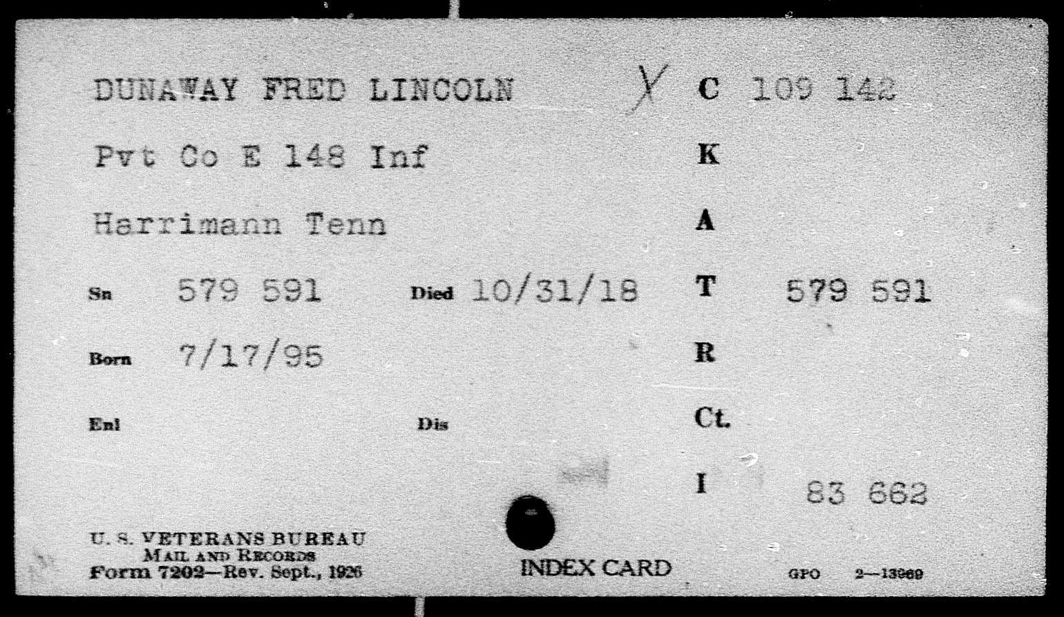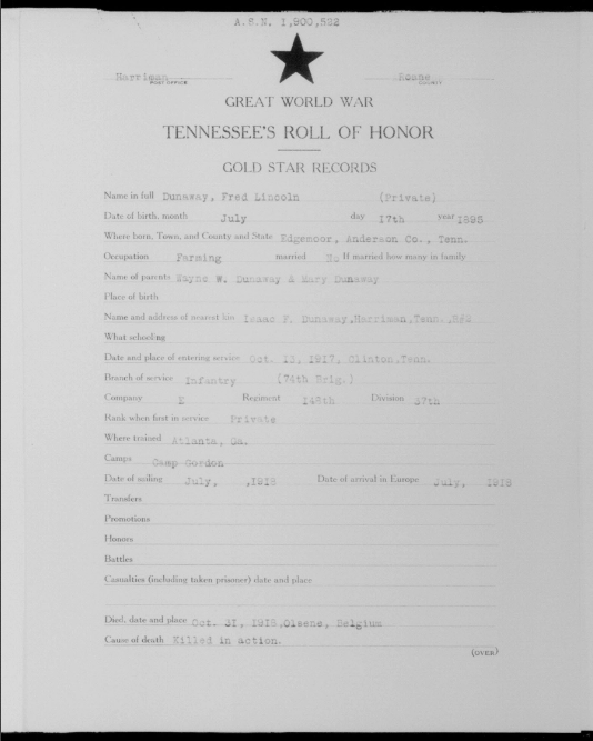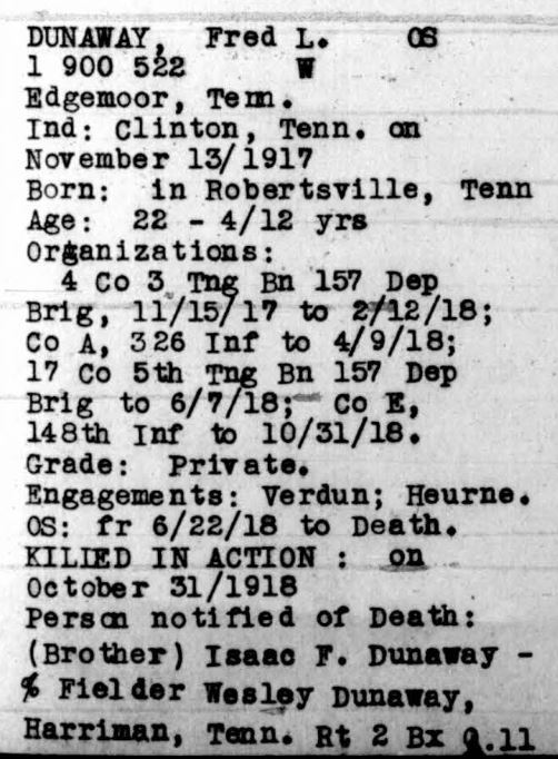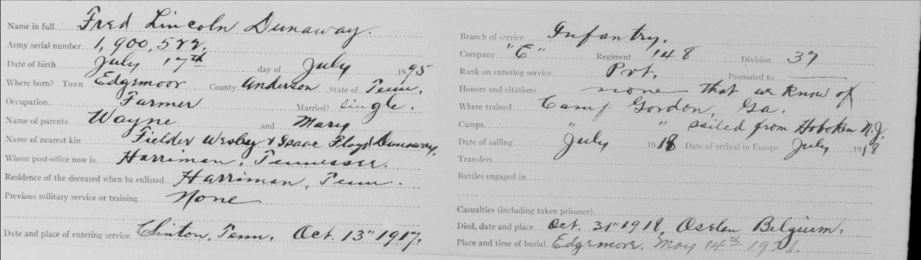 Private Fred Lincoln Dunaway was born on July 17, 1895 in Robertsville, Tennessee. He was the son of Wayne W. and Mary Dunaway. He was the brother of Fielder Dunaway and Floyd Dunaway. Prior to joining the military he worked on his own farm in Edgemoor, Tennessee. He served with the 148th Infantry, Company E. He was killed in action during World War I at Olsene in Belgium.
