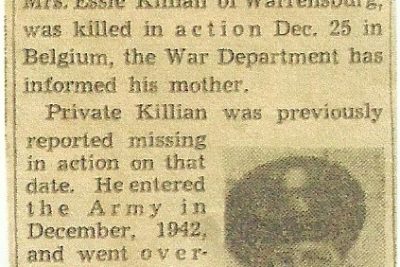 Pvt. Fred M. Killion, 30, son of Mrs. Essie Killion of Warrensburg, was killed in action Dec. 25 in Belgium, the War Department has informed his mother. Private Killian was previously reported missing in action on that date. He entered the Army in December, 1942, and went overseas in December, 1943, to become attached to a military police outfit. A letter from his chaplain to his mother stated that Private Killion was buried in a national cemetery in the province of Lorraine, France, with a protestant chaplain officiating at the ceremonies. He has two brothers in service, one of whom is overseas.
