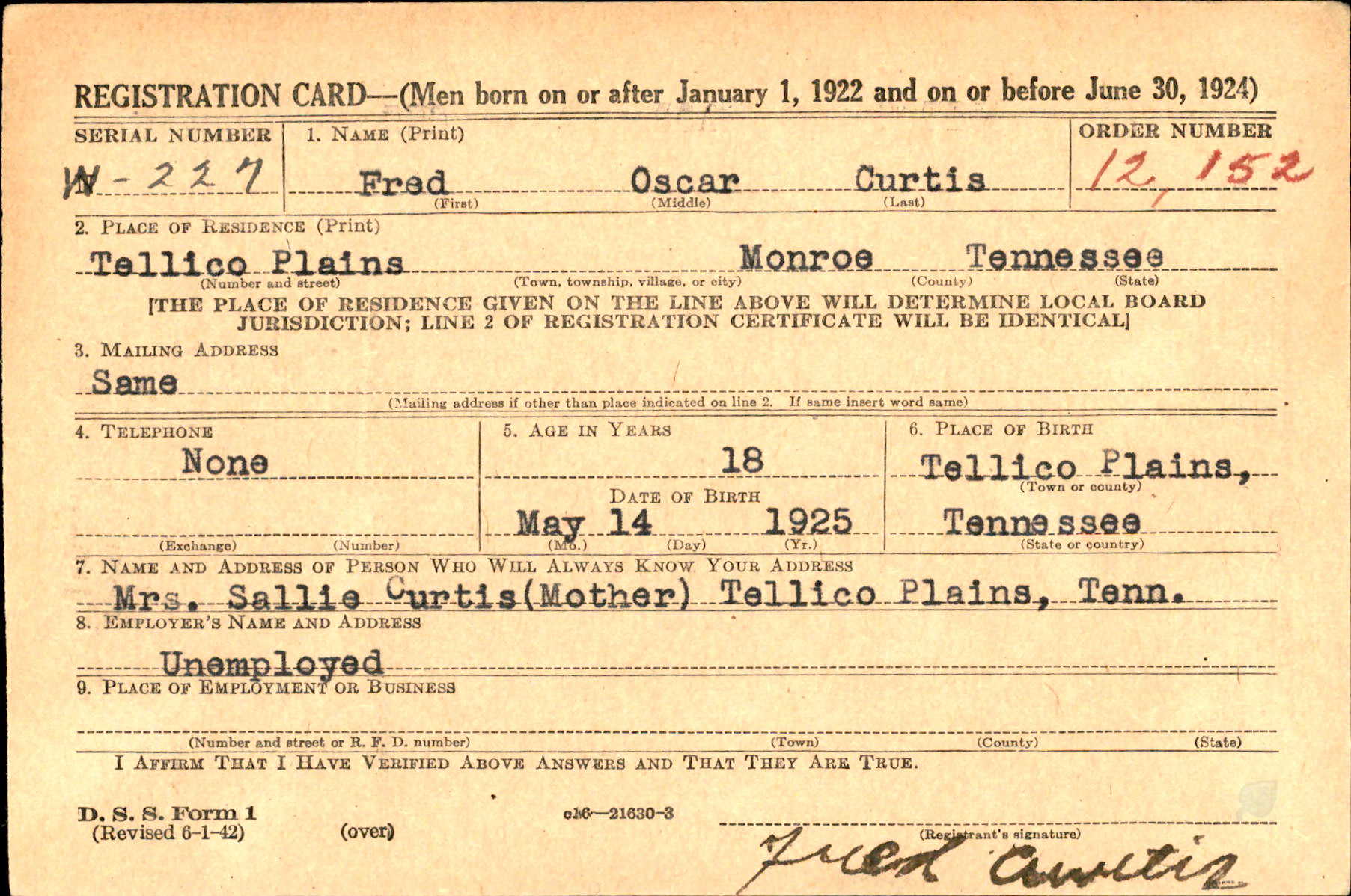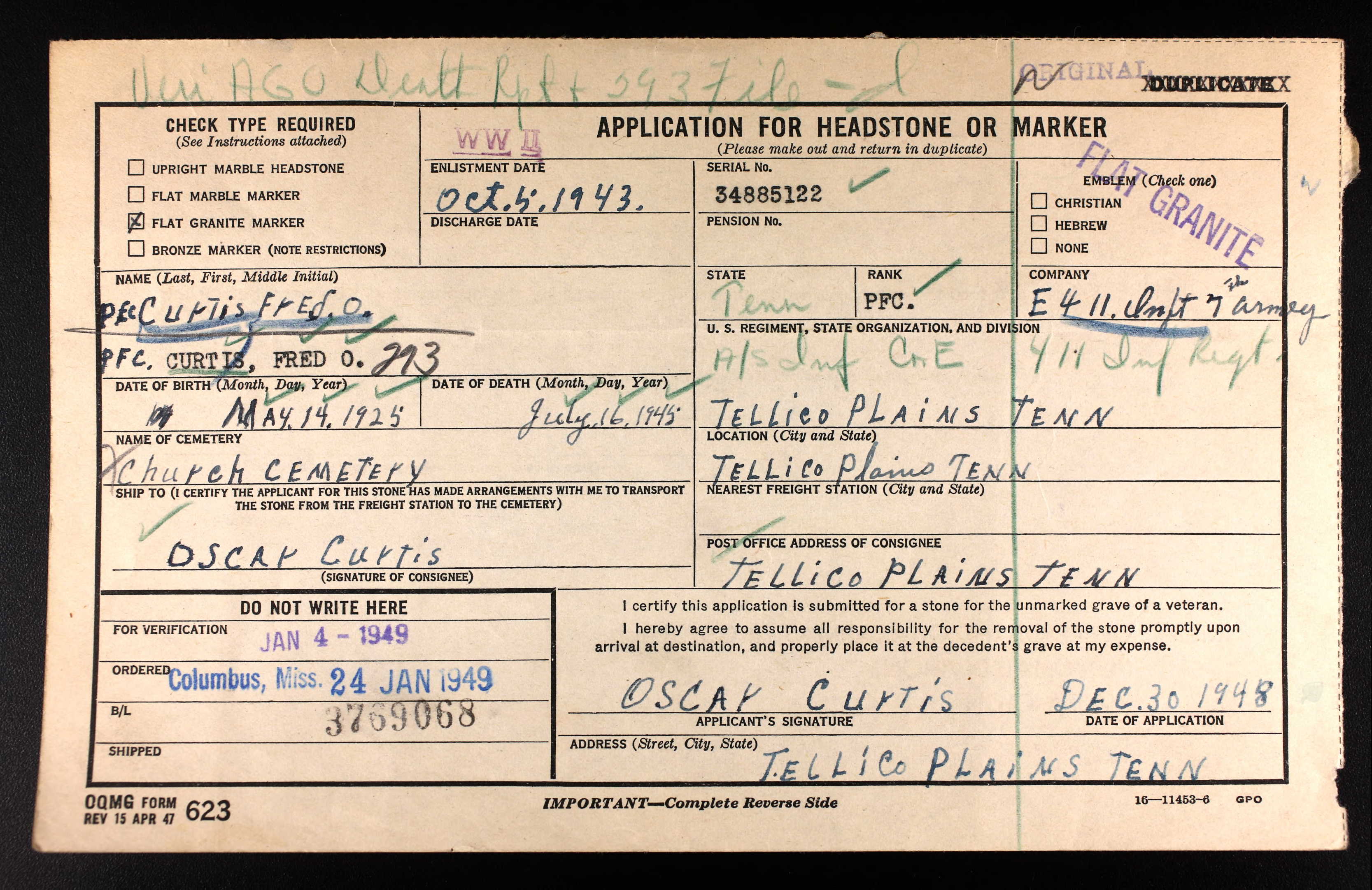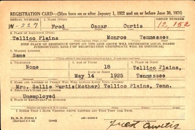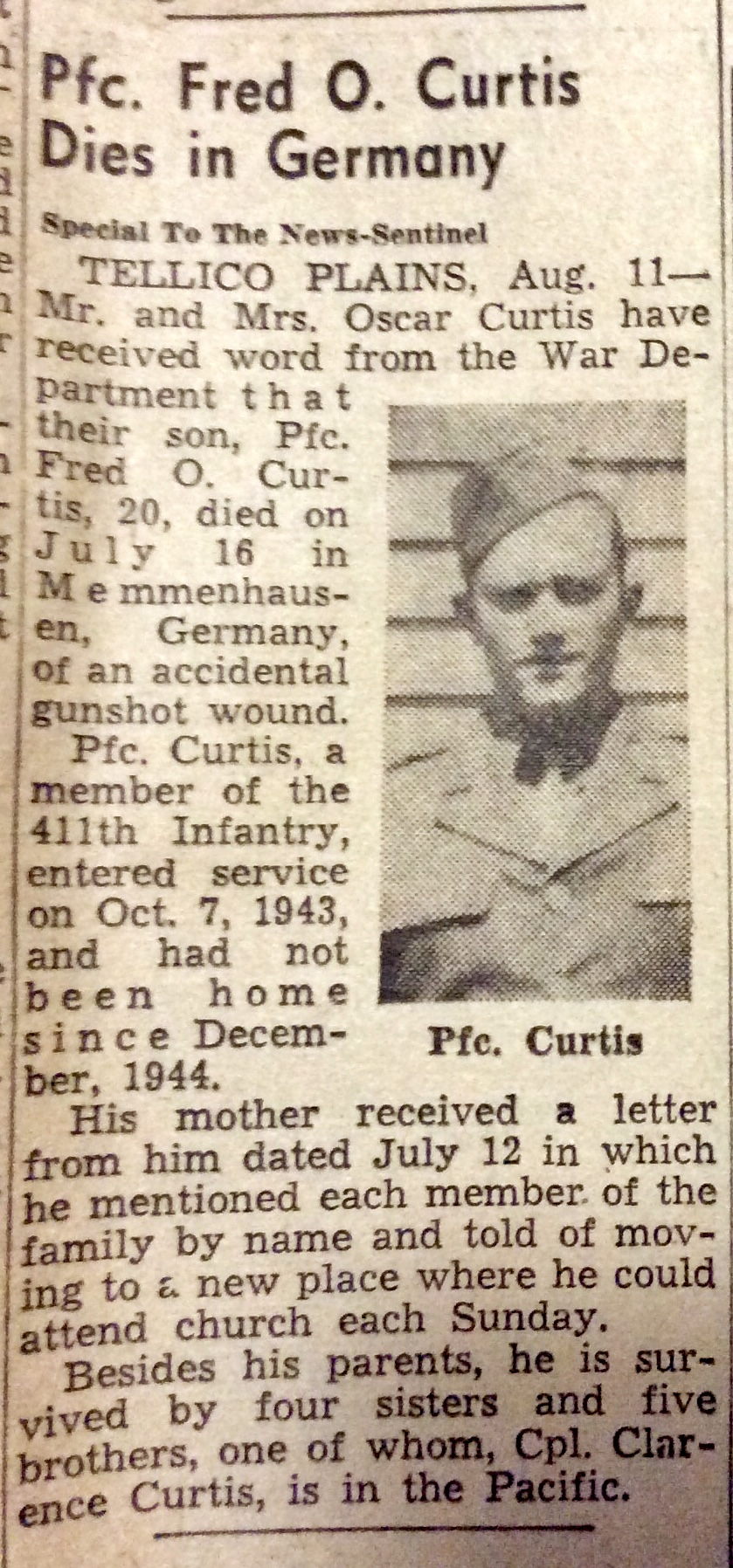 Fred Oscar Curtis was born May 14, 1925 to Oscar J. Curtis and Sallie Thomas of Tellico Plains. Oscar was from a large family and had six brothers, Raymond, Homer, Clarence, Clyde, Kenneth, and Earl Curtis, and four sisters, Bessie, Eva Nell, Louise and Mary Curtis. He went to school at Tellico Plains High School and later enlisted in the US Army on September 14, 1943 at Fort Oglethorpe, Georgia. Private First Class Fred O. Curtis was a member of the 411th Infantry Regiment, 103rd Infantry Division. He died non battle on July 16, 1945 in Memmenhausen, Germany. He is buried at Tellico Plains Cemetery, Tellico Plains, Tennessee.
