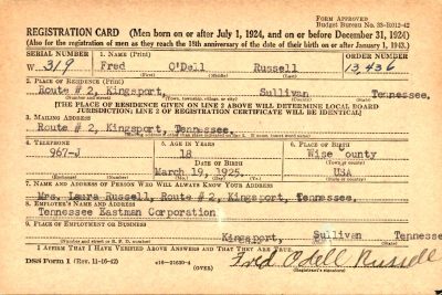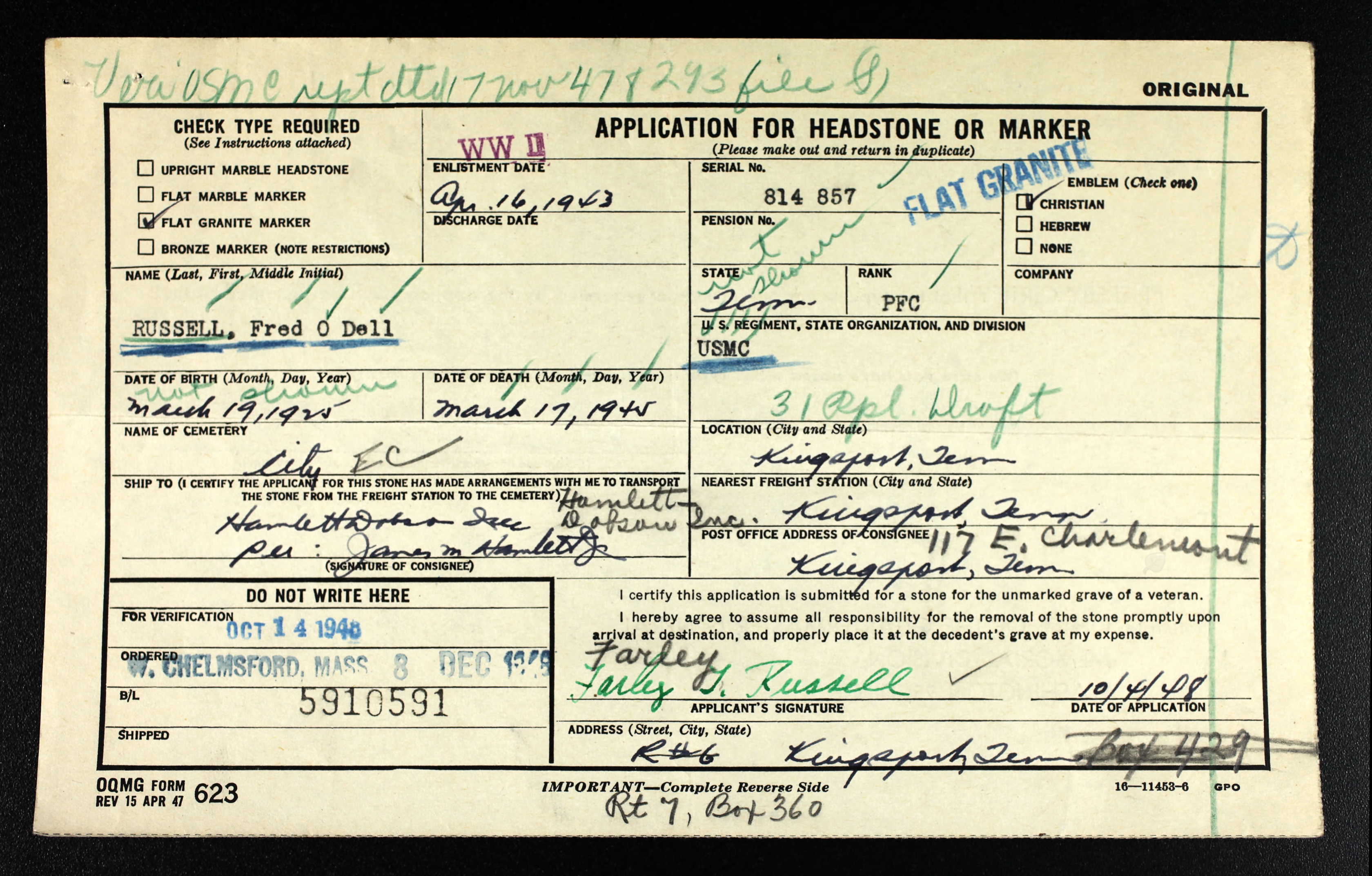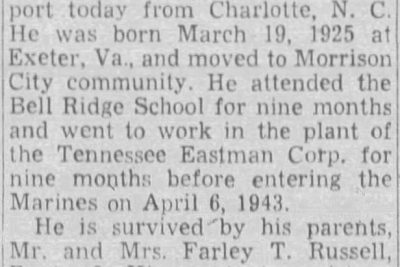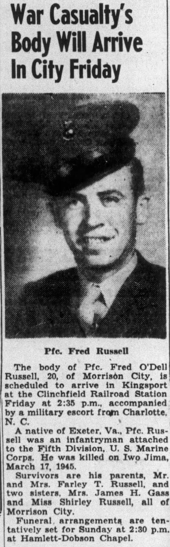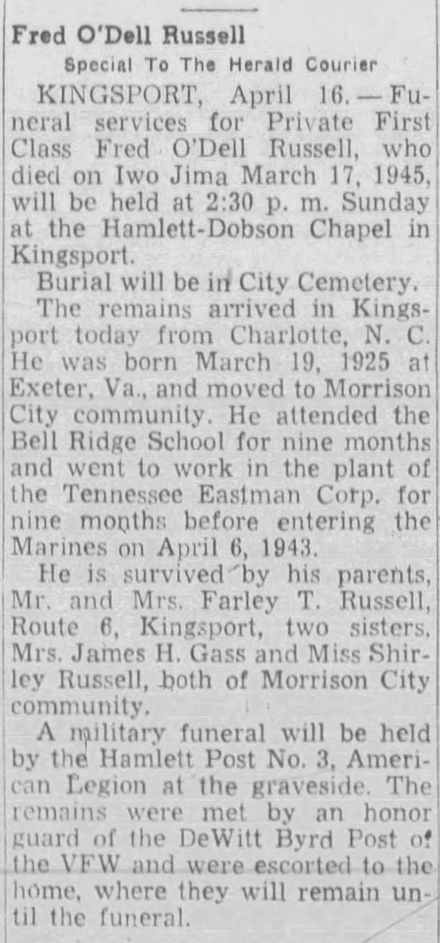 Funeral services for Private First Class Fred O’Dell Russell, who died on Iwo Jima March 17, 1945, will be held at the Hamlett-Dobson Chapel in Kingsport. Burial will be in City Cemetery. The remains arrived in Kingsport today from Charlotte, N.C. He was born March 19, 1925 at Exeter, Va., and moved to Morrison City community. He attended the Bell Ridge School for nine months and went to work in the plant of the Tennessee Eastman Corp. for nine months before entering the Marines on April 6, 1943. He is survived by his parents, Mr. and Mrs. Farley T. Russell, Route 6, Kingsport, two sisters, Mrs. James H. Gass and Miss Shirley Russell, both of Morrison City community.