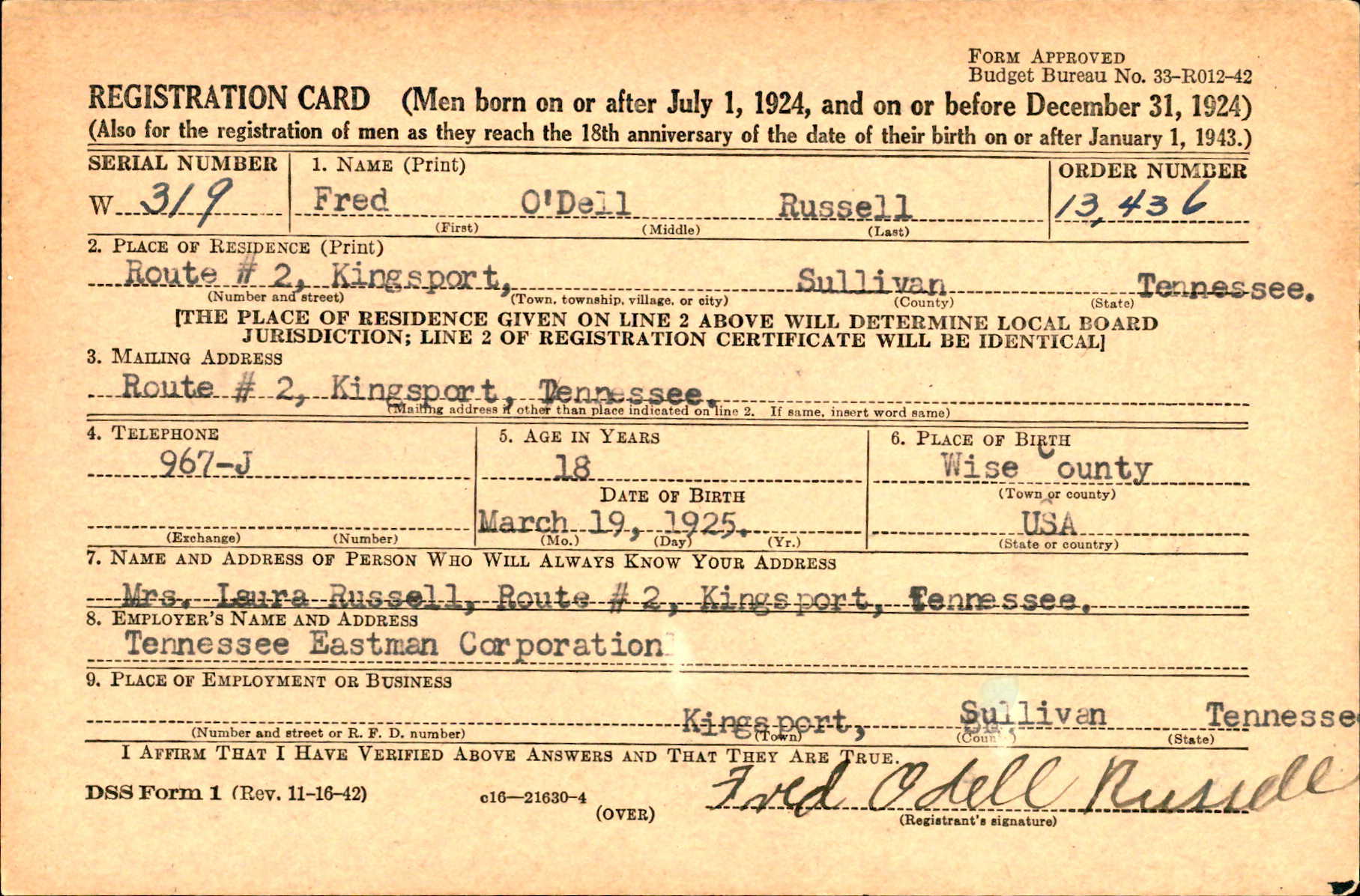 Fred O’Dell Russell was born in Wise, Virginia, the son of Farley Thomas Russell and Laura Elizabeth Jennings.