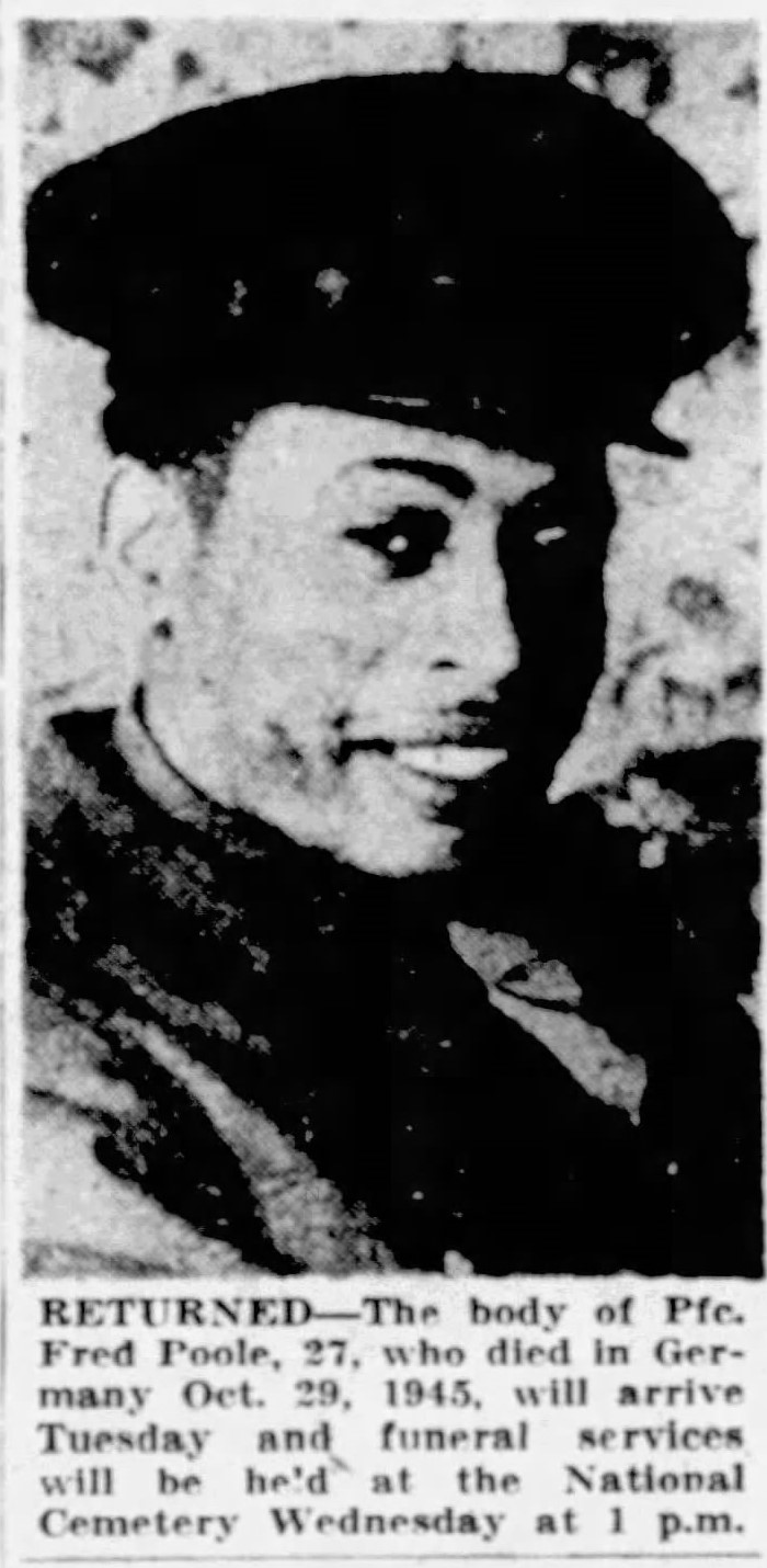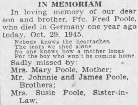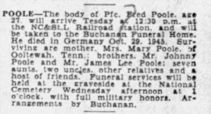 The body of Pfc. Fred Poole, age 27, will arrive at the NC&St.L Railroad station and will be taken to the Buchanan Funeral Home. He died in Germany Oct. 29, 1945. Surviving are mother, Mrs. Mary Poole, of Ooltewah, Tenn.: brothers, Mrs. Johnny Poole and Mr. James Lee Poole; seven aunts, two uncles, other relatives and a host of friends.
