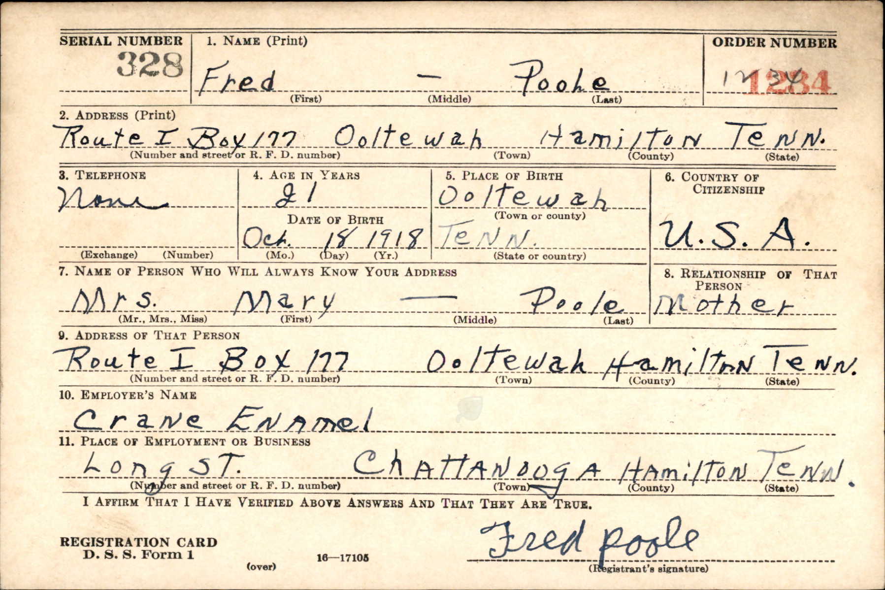 Fred Poole was born in Ooltewah on 19 October 1918 to Foster Poole and Mary Nailor.