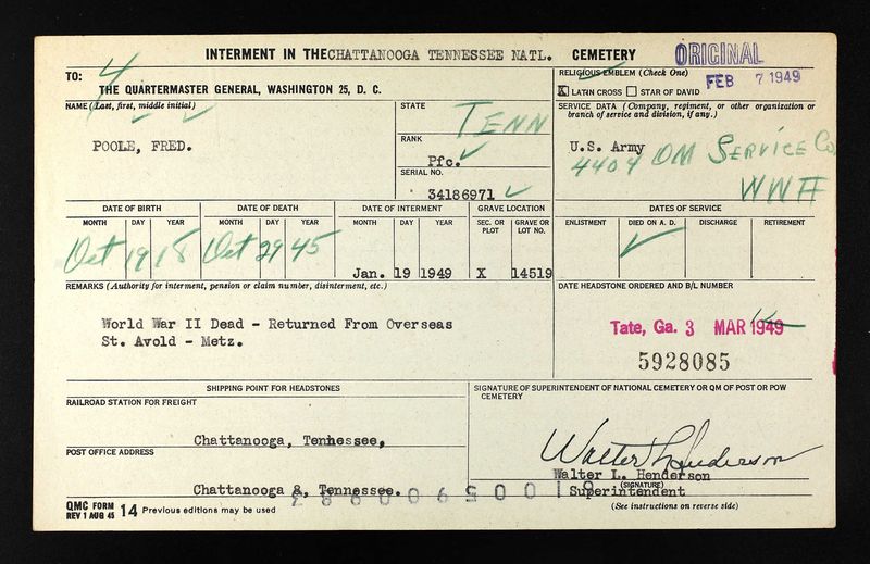 Died non Battle 29 October 1945 in Germany. PFC Poole was initially buried at St. Avold-Metz. Buried at Chattanooga National Cemetery, X, 14519.