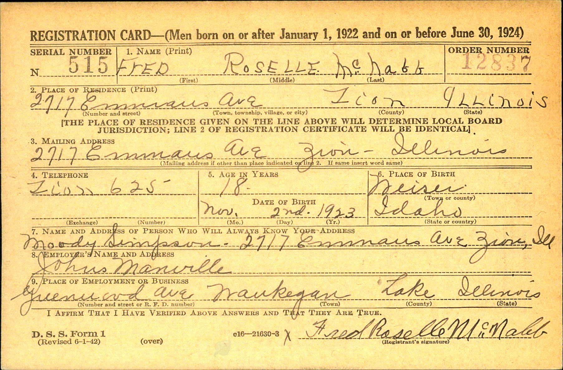 Frederick “Fred” Roselle McNabb was born on 2 November 1923 in Weiser, Idaho. He was the son of William Oliver McNabb and Mamie Morgan Simpson.