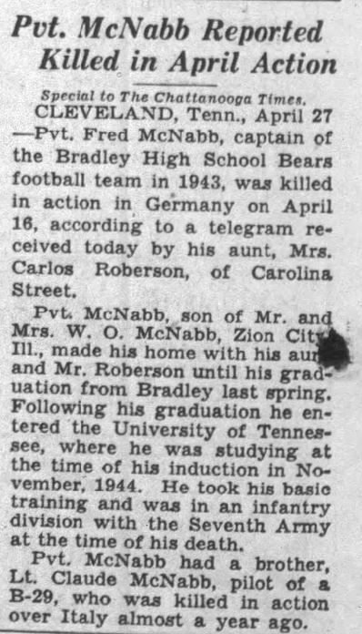 Pvt. Fred McNabb, captain of the Bradley High School Bears football team in 1943, was killed in action in Germany on April 16, according to a telegram received by his aunt, Mrs. Carlos Roberson, of Carolina Street. Pvt. McNabb, son of Mr. and Mrs. W.O. McNabb, Zion City, Ill., made his home with his aunt and Mr. Roberson until his graduation from Bradley last spring. Following his graduation he entered the University of Tennessee, where he was studying at the time of his induction in November, 1944. He took his basic training and was in an infantry division with the Seventh Army at the time of his death. Pvt. McNabb had a brother, Lt. Claude McNabb, pilot of a B-29, who was killed in action over Italy almost a year ago.