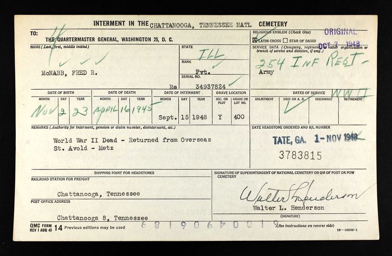 PVt McNabb was initially buried at St. Avold-Metz, France.