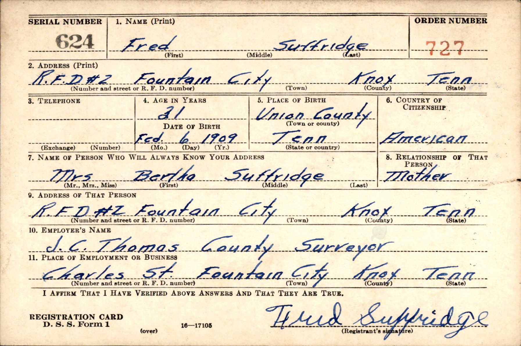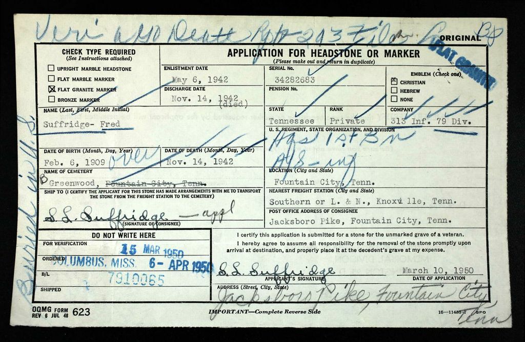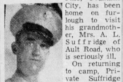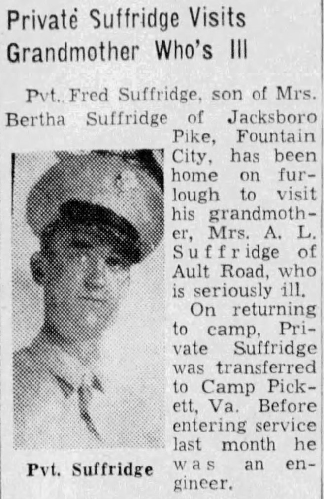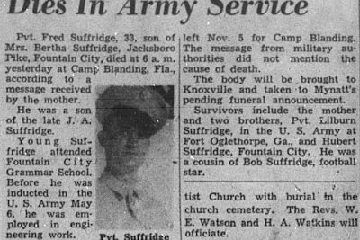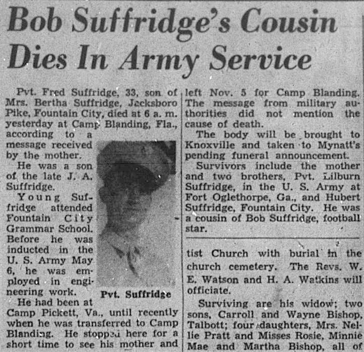 Pvt. Fred Suffridge, 33, son of Mrs. Bertha Suffridge, Jacksboro Pike, Fountain City, died at 6 a.m. yesterday at Camp Blanding, Fla., according to a message received by the mother. He was a son of the late J.A. Suffridge. Young Suffridge attended Fountain City Grammar School. Before he was inducted in the U.S. Army May 6, he was employed in engineering work. He had been at Camp Pickett, Va., until recently when he was transferred to Camp Blanding. He stopped here for a short time to see his mother and left Nov. 5 for Camp Blanding. The message from military authorities did not mention the cause of death. The body will be brought to Knoxville and taken to Mynatt’s pending funeral announcement. Survivors include the mother and two brothers, Pvt. Lilburn Suffridge, in the U.S. Army at Fort Oglethorpe, Ga., and Hubert Suffridge, Fountain City. He was a cousin of Bob Suffridge, football star.