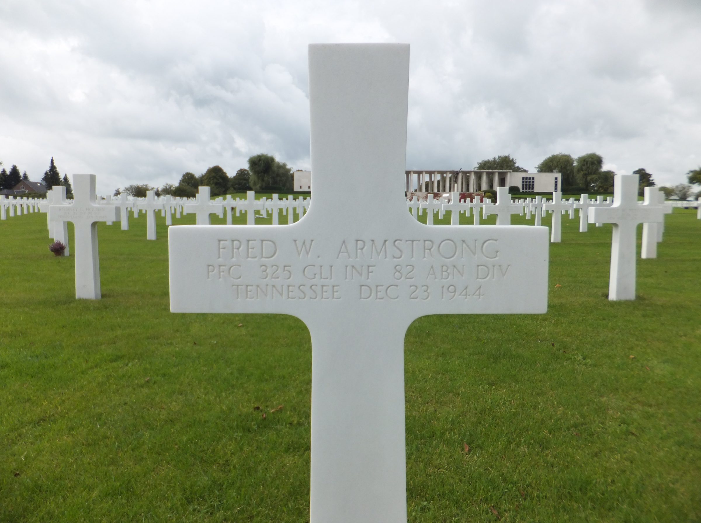 Fred’s combat glider drop would come on 7 June 1944 during Operation Overlord, the day after the invasion began in the vicinity of Ste-Mère-Eglise to reinforce the Parachute Regiments that dropped in the morning before on D-Day. After 33 days of bloody combat, the 82nd was pulled back to England for a rest and to re-outfit. On 17 September, Fred and the 82nd conducted its fourth combat assault of the war during Operation Market Garden in the Netherlands and captured all their objectives. Due to the defeat of other Allied Forces at the Battle of Arnhem, they were sent to France. On 18 December, two days after the Germans launched a surprise offensive through the Ardennes Forest, Fred and his unit joined the fight that became known as the Battle of the Bulge. It was during this battle at Baraque-de-Fraiture, Belgium on 23 December 1944 that Fred was killed in action. He was 30 years old and, for his actions, he was awarded the Purple Heart.