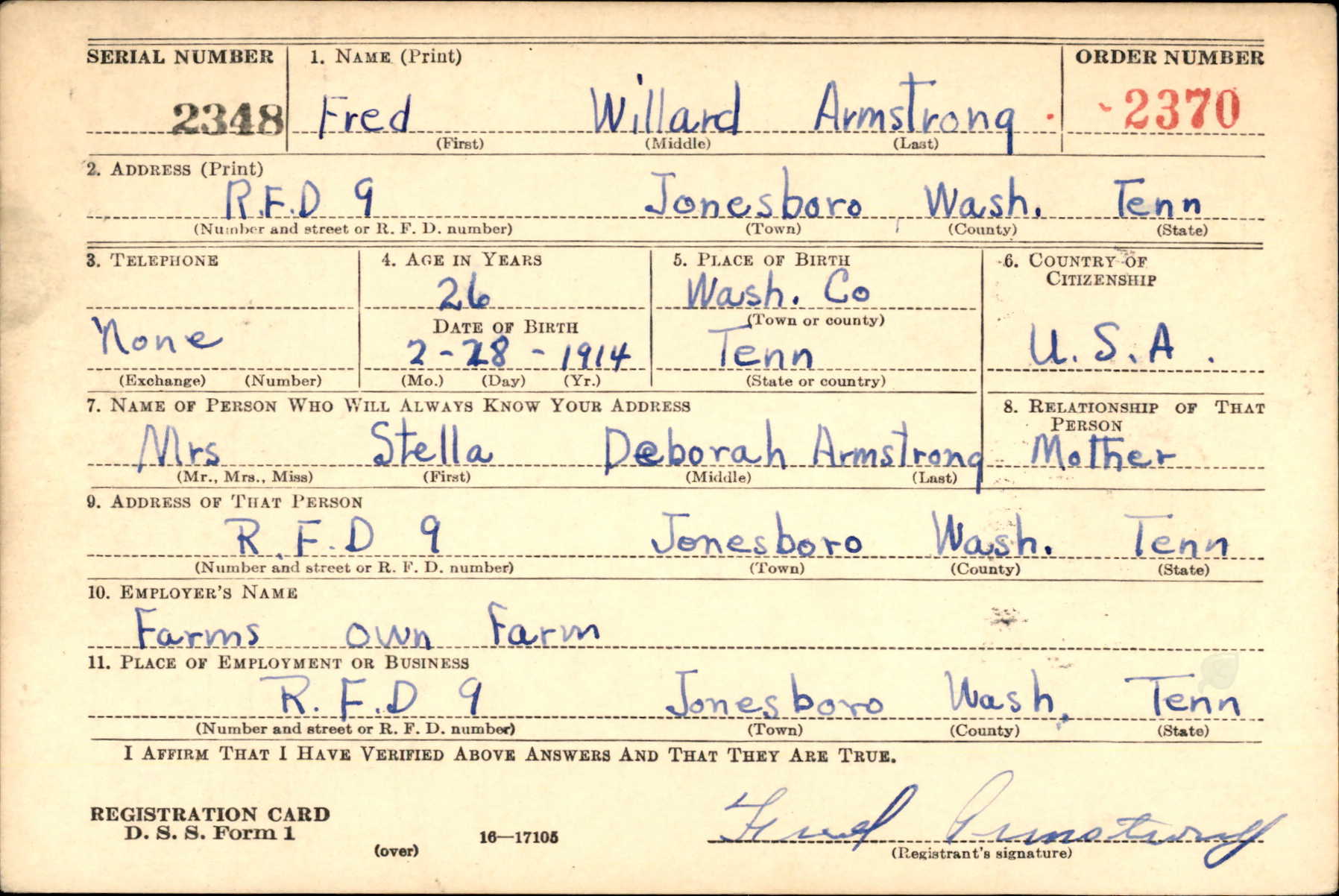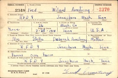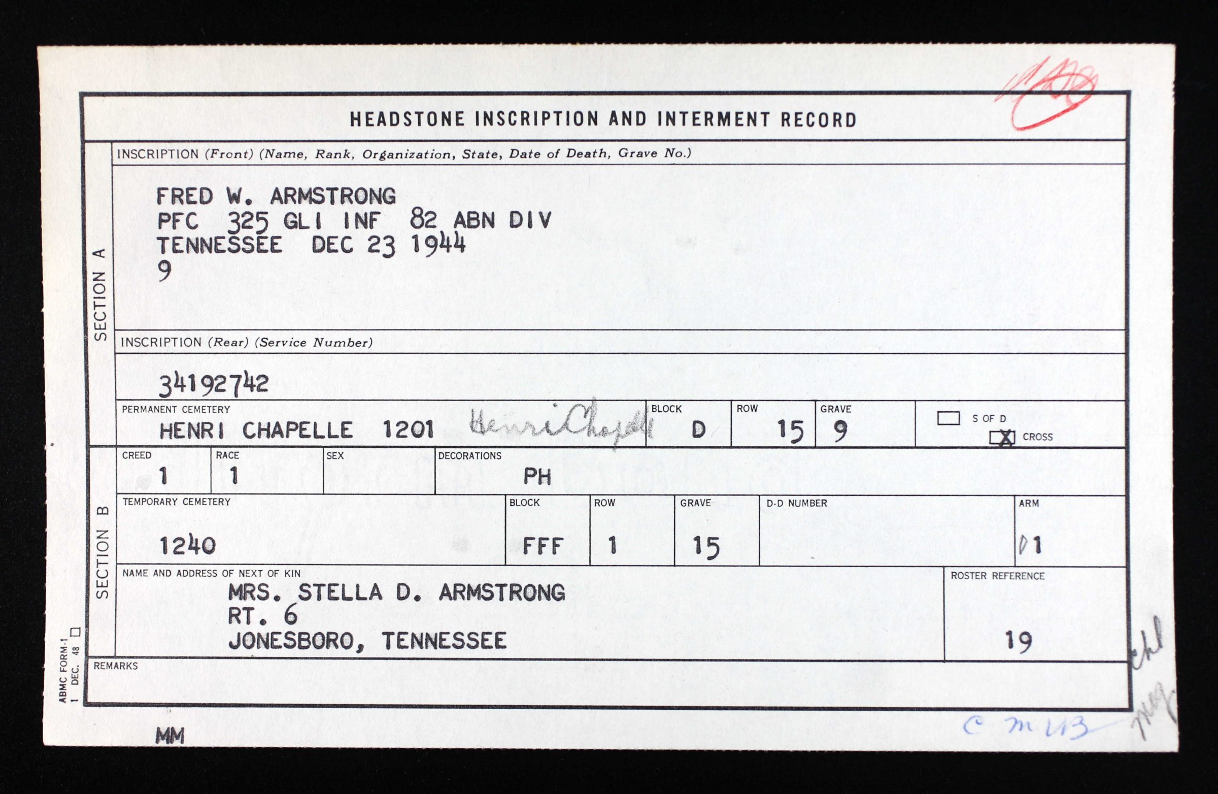 Fred participated in six unit campaigns Tunisia, Sicily, Naples-Foggia, Normandy, Rhineland and the Ardennes-Alsace. He’s interred at the Henri-Chapelle American Cemetery, Plot D, Row 15, Grave 9 in Henri-Chapelle, Liège, Belgium. Fred also has a memorial marker at Fairview United Methodist Church Cemetery, Section 2, Row 2, Grave 17 in Jonesborough, Tennessee.