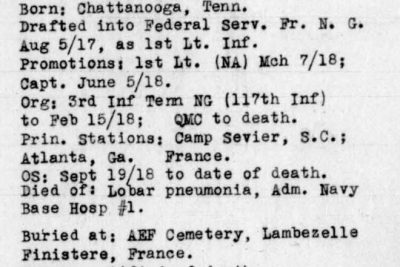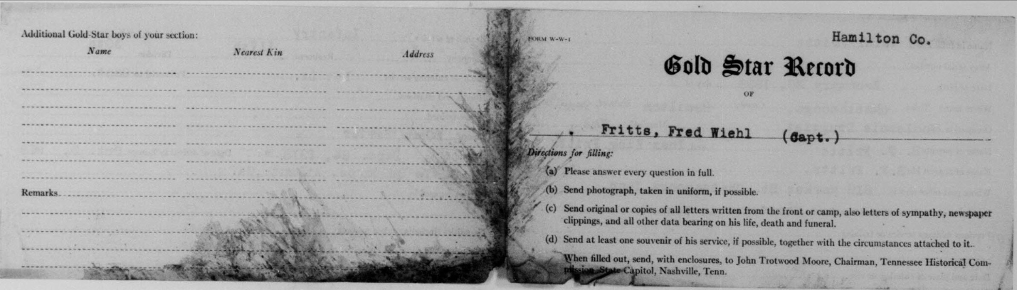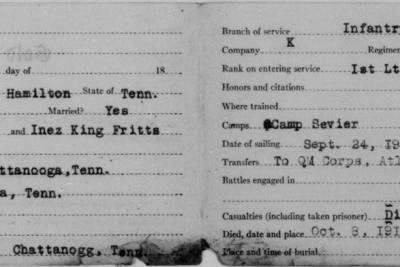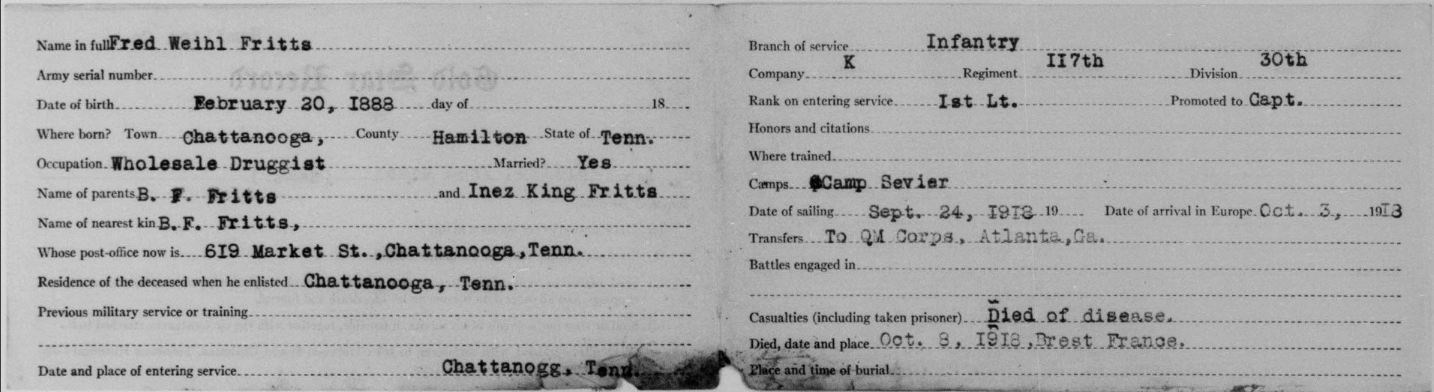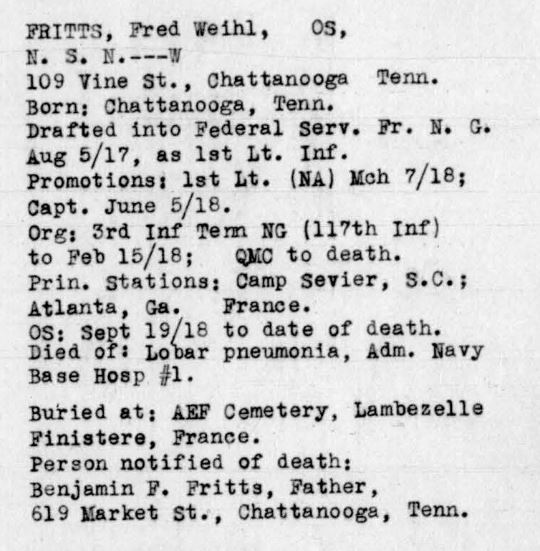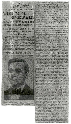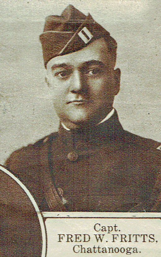 Capt. Fritts was one of Chattanooga’s best known and most popular Young men. He numbered his friends by his acqaintances. Possessing a genial, sunshiny disposition, he made friend where ever he went. He was born and reared in Chattanooga, attending the public schools, McCallie, Baylor and the Webb school. At an early age, or soon after leaving school, he became connected with Fritts and Wiehl and was secretary and treasurer of the firm at the time he offered his service to the country and flag he loved so dearly. He was a member of Centenary M.E. church, south of affiliated with a number of fraternal and social organizations. He was first commissioned as a lieutenant in the national guard and acted as recruiting officer here for a time. Later, when members of the guard were mustered into federal service, he was commissioned a captain in the quartermaster corps. He was first stationed at Atlanta. When stricken with the dread pneumonia he was on his way to Europe.
