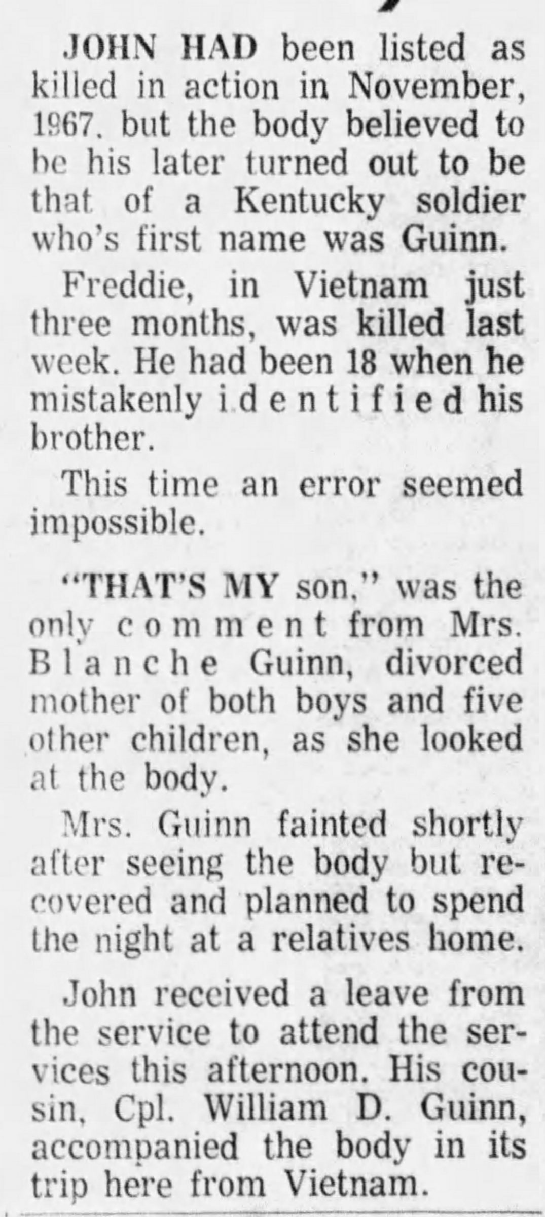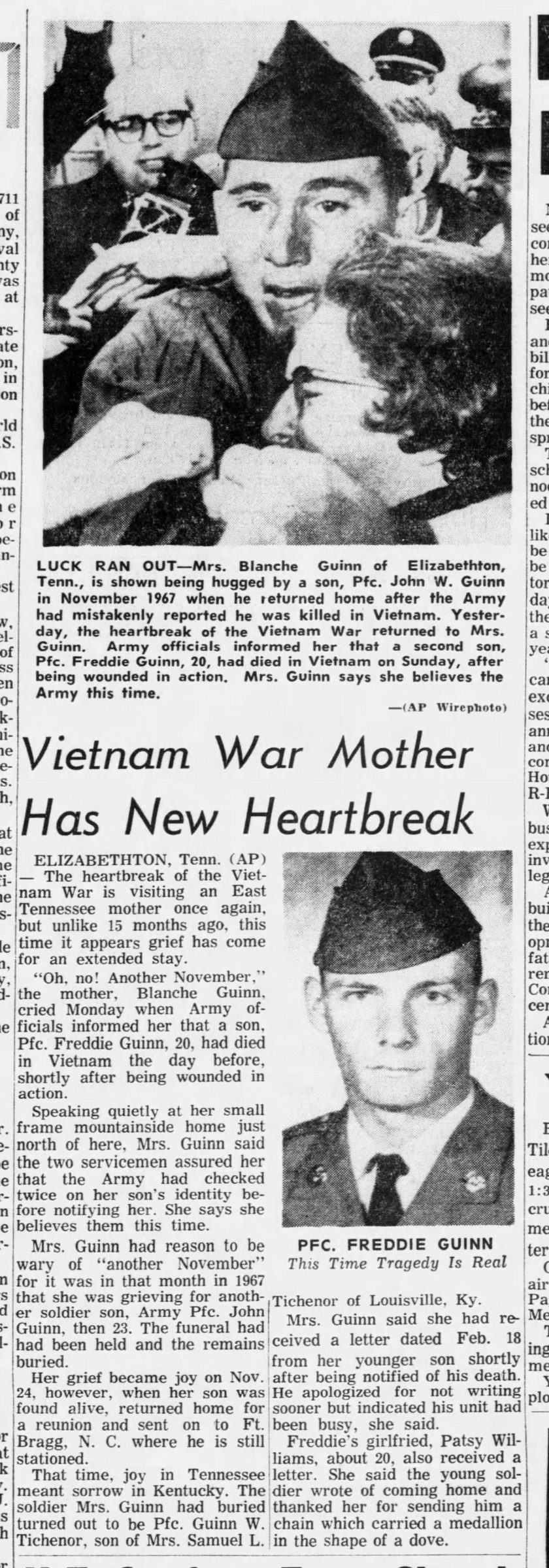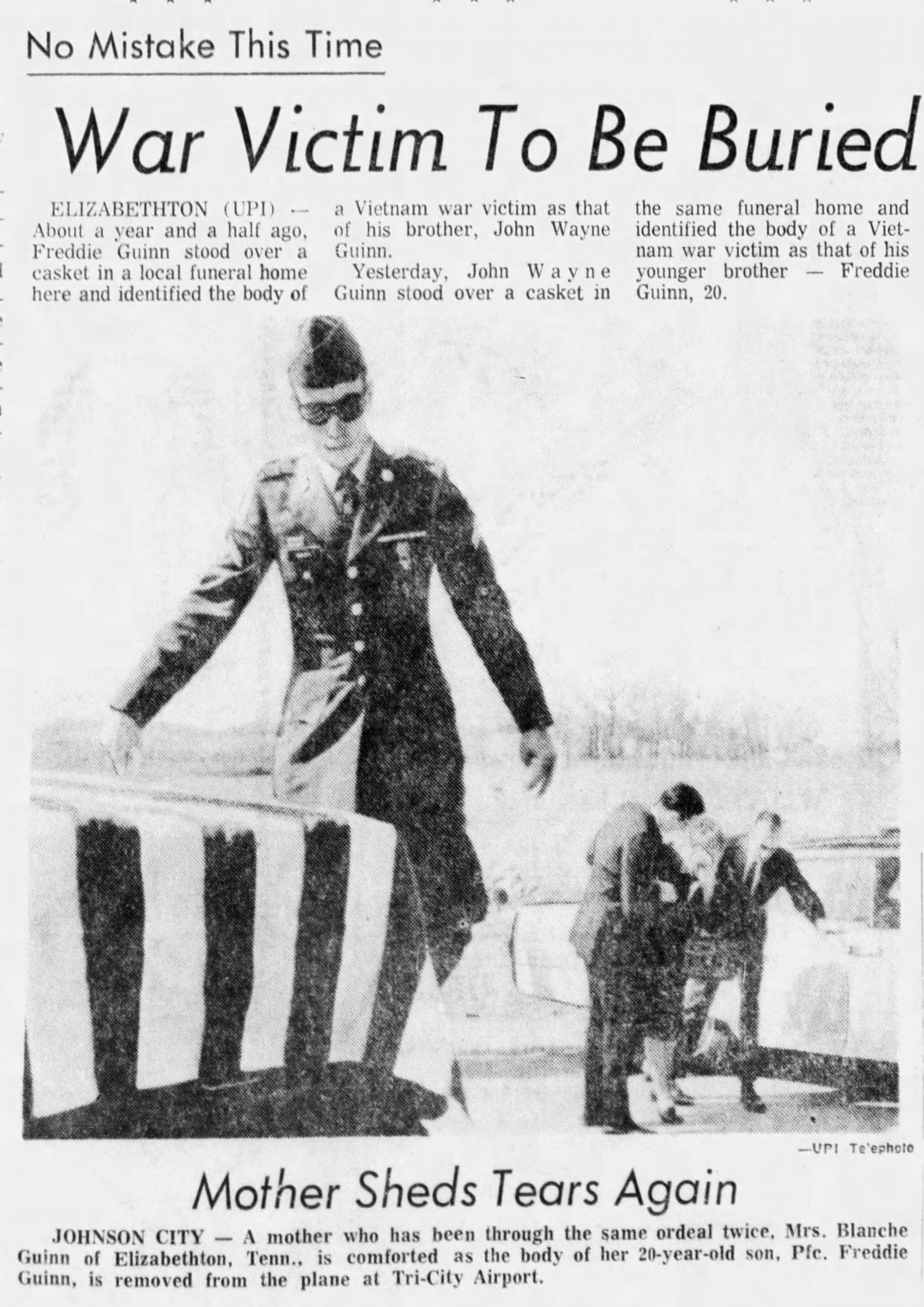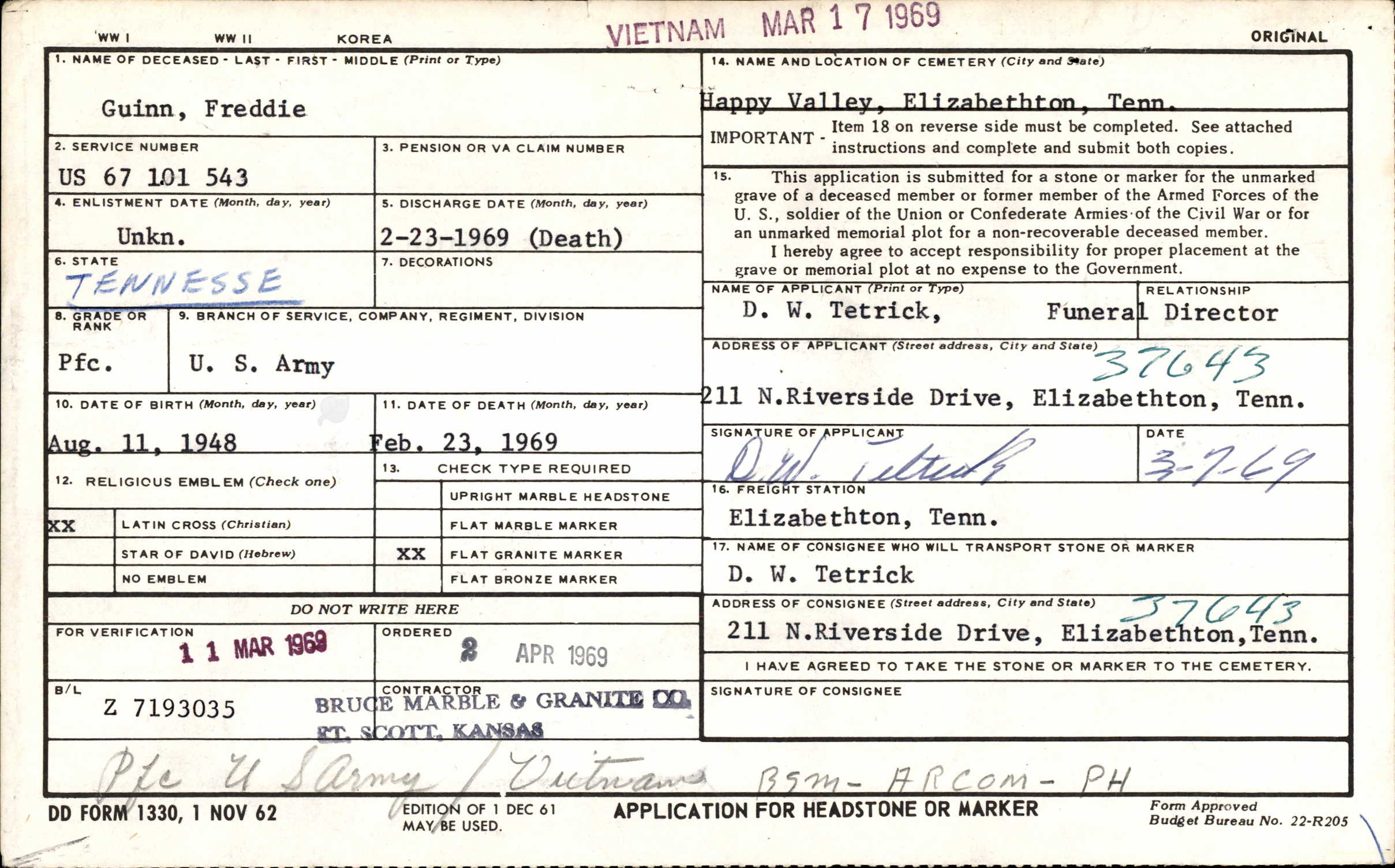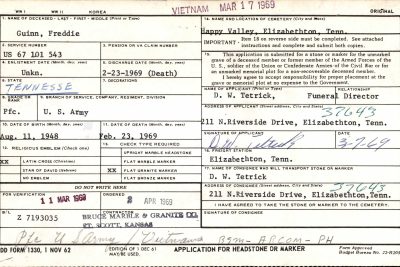 Corporal Freddie Ray Guinn was born on August 11, 1948, and was originally from Elizabethton, Tennessee. He served his country in the Vietnam War in the United States Army, as an infantryman in B Company, 2nd Battalion, 39th Infantry, 9th Infantry Division. His tour in Vietnam began on November 16, 1968. Several months later, on February 23, 1969, Cpl. Guinn was killed from artillery fire in Dinh Tuong province, South Vietnam; he was 20 years old at the time of his death. Cpl. Guinn is memorialized on the Vietnam Veterans Memorial on Panel 31W, Line 7.